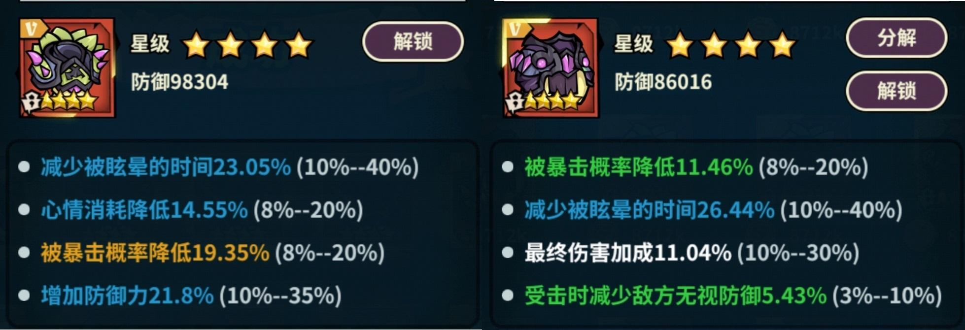 上图左侧与右侧同为霸体坦克(米迦勒)的三词条胚子,但左侧想要成为四词条就需要在第二条洗出生命词条,而右侧在三词条位置洗出生命或防御皆可成为四词条完美装备。
