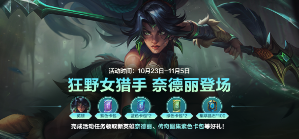 狂野女猎手 奈德丽即将登场!10月23日10:00-11月5日23:59活动期间,召唤师完成活动任务即可领取新英雄奈德丽、传奇图集紫色卡包等好礼!