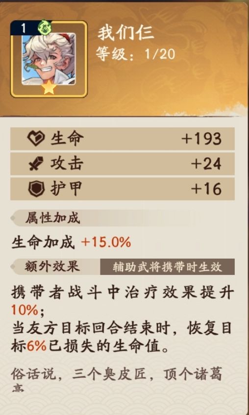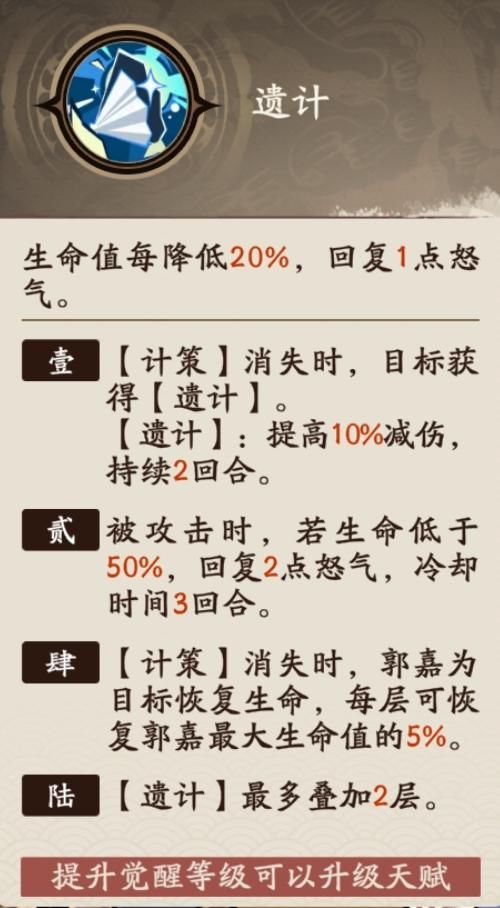 作为下位替代,此专武可以让郭嘉提升自身生命值,加强战场能力的同时,还能及时补充关键怒气,有效防止卡2怒/1怒导致无法放出关键技能的问题。