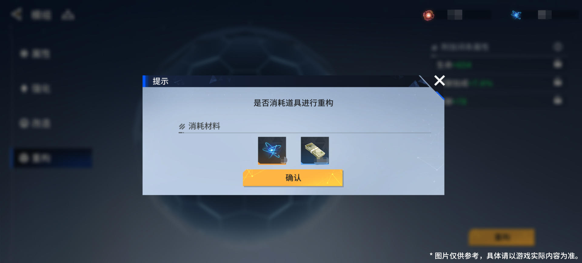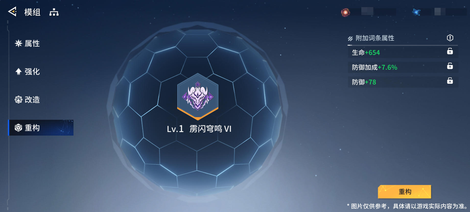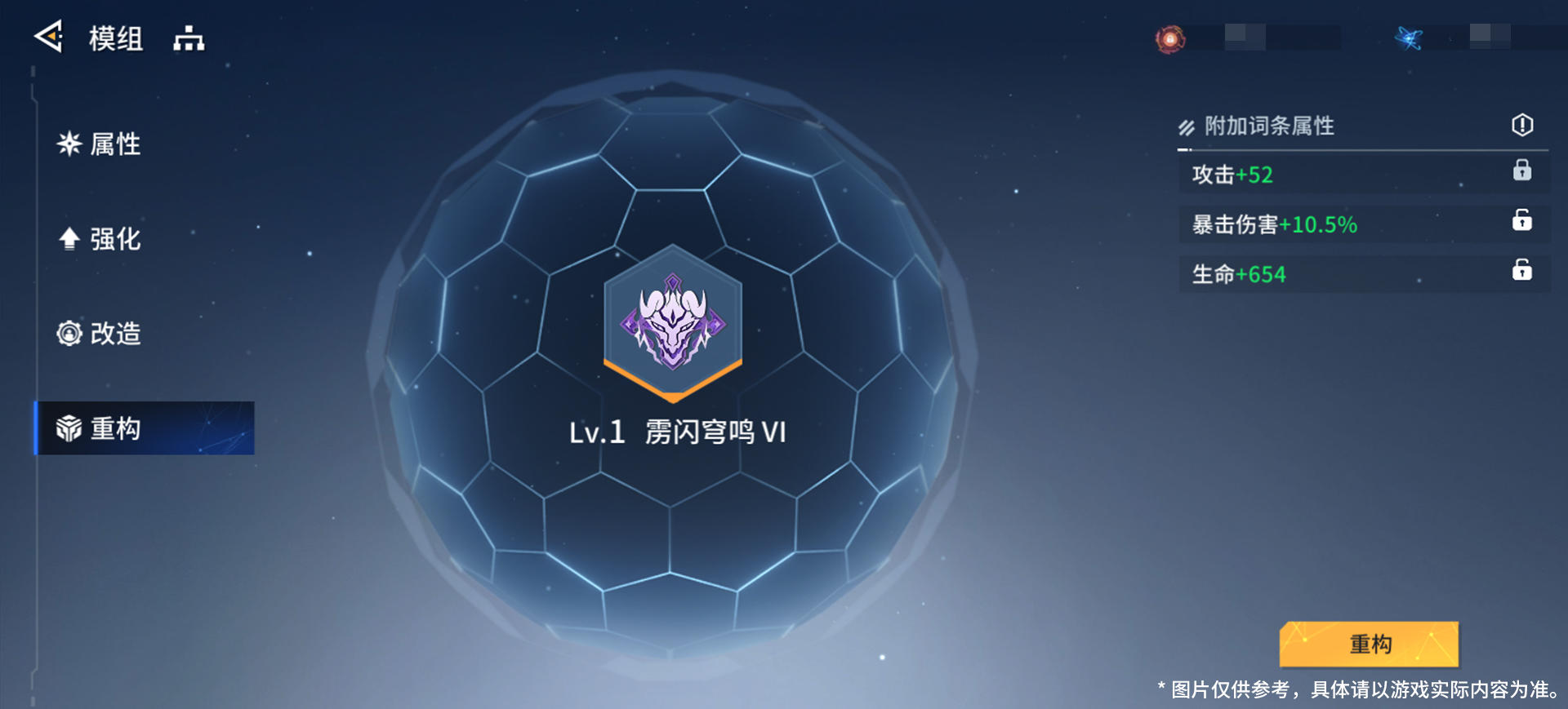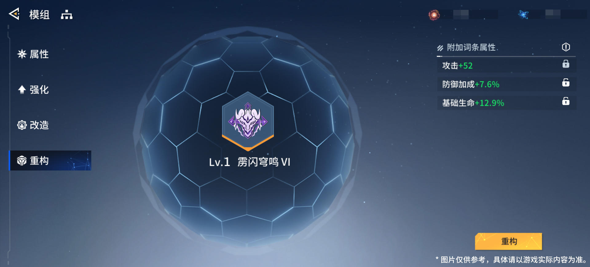 1. 进入功能界面后,点击【重构】按钮,系统将消耗对应道具,为该模组重新生成 3 条随机附加词条属性;