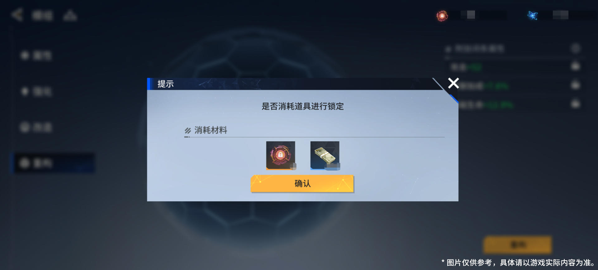 3. 若需保留部分属性词条,可点击目标属性旁的【锁定】按钮,系统将消耗对应材料完成锁定(锁定后该属性在后续重构中不会变更);需注意,锁定的属性条数越多,后续执行重构操作时的道具消耗会相应增加。