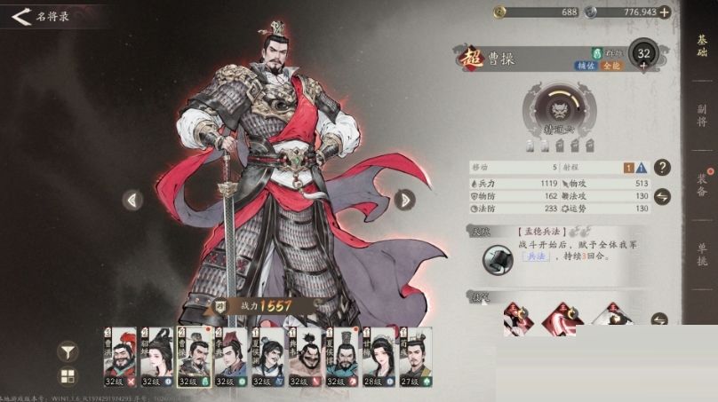 1、曹操 —— 全能辅助型武将,具有超强的辅助和输出能力,可以给队伍都带来多种增益效果,适配各类阵容,非常全面。