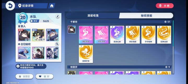 水队无须质疑登顶,无论手感还是伤害都没得说,苍兰还是要的,我看有些人说苍兰没用,但其实援护技比小书包好得多。记得一定要选镜影腾蛇走普攻流,援护角色都为主位服务就好。
