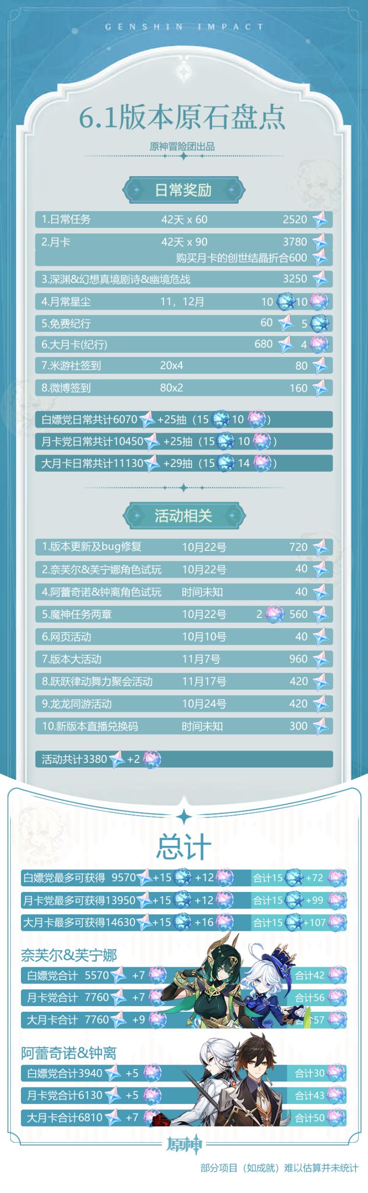 月之二版本终于要更新了,我们根据已有的信息对月之二版本获得的原石数量获得的原石数量进行了计算,每部分还有详细依据,方便大家心中有数统计范围从10月22日版本更新开始,以版本持续42天进行计算,奈芙尔&芙宁娜池,阿蕾奇诺&钟离池情况也分别进行了统计,月卡/纪行作为一个可选项列在表中未知成就等难以统一的部分未列入表中,所以预计大家实际能够获取的原石数量会比统计数高一些特别提醒,因为月之二版本的更新维护预计时间延长了两个小时,所以更新补偿比正常版本多了120原石相关说明
