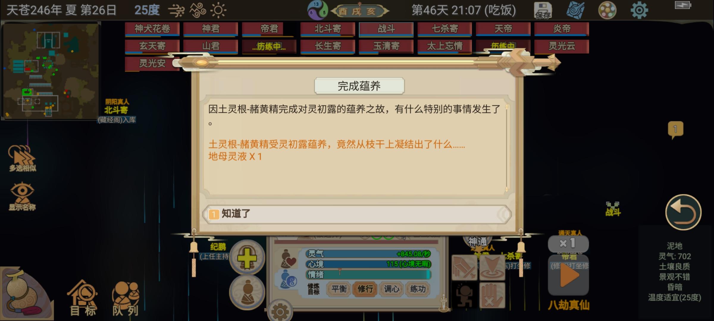天帝和炎帝为太上忘情淬炼丹药:“紫阳x2”、“地母灵液x2”、“紫色毁丹”、“万灵散”等。