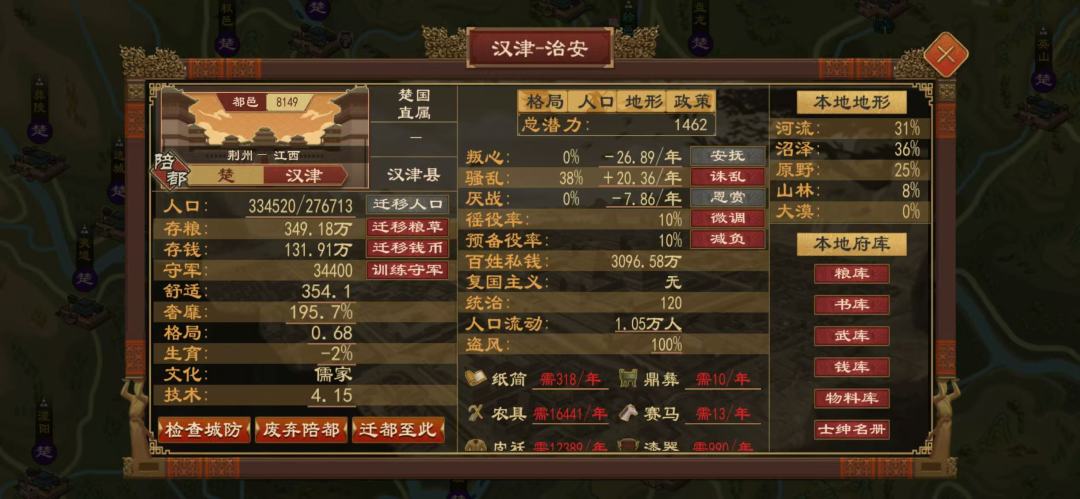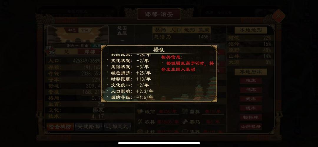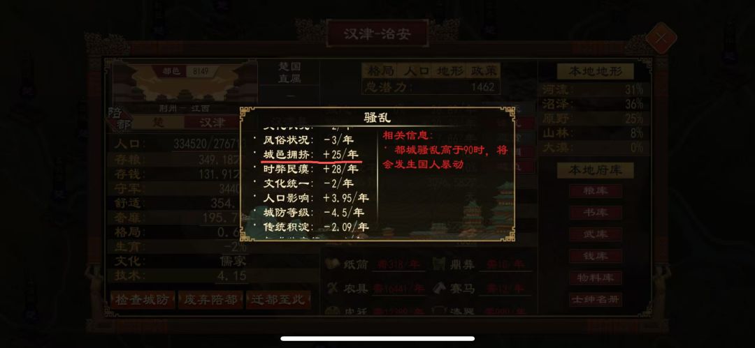 很久以前我就发现了这个情况,但那时还没有许多buff设定,所以也无甚影响,等着它流入人口和生育率负值达到平衡即可。但随着各种buff被设计加入到游戏中,人口累积造成了恶果:’盗风‘会因为外来人口不断而难以压下,’骚乱‘里加上’时弊民瘼‘,又加上一个’城市拥挤‘。这个’拥挤‘有时加的甚至比’时弊民瘼‘还高。大量修建学校也不过加点’饱学度‘。很快都城的骚乱就有点棘手了。但这些人还都是’庶民‘,并非流民(监狱也不能抓),且人口量大、其他城邑上限小,不好迁移。这下不得不召开都城’扫黑除恶‘专项行动,一口气在都城、陪都砍了十几万人。(砍完了还会继续吸)