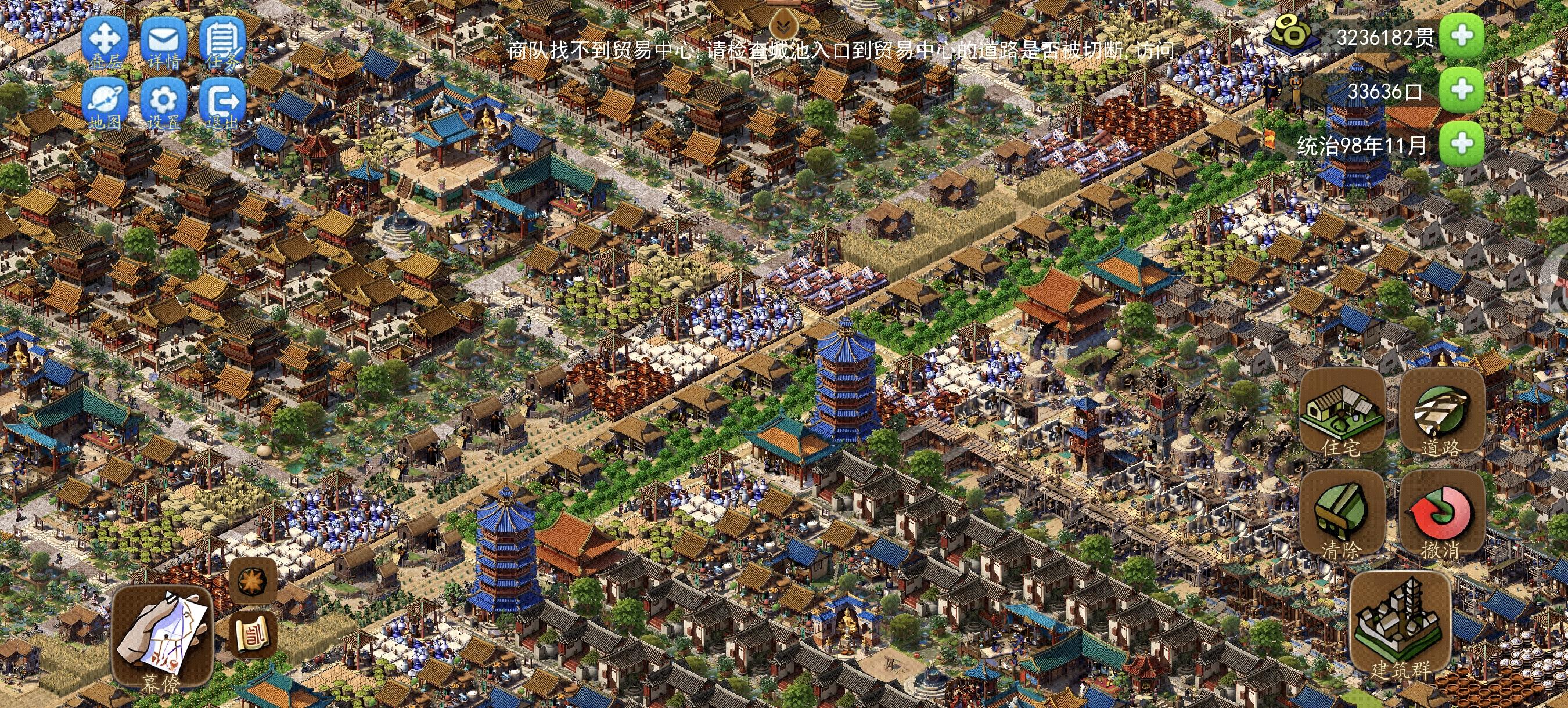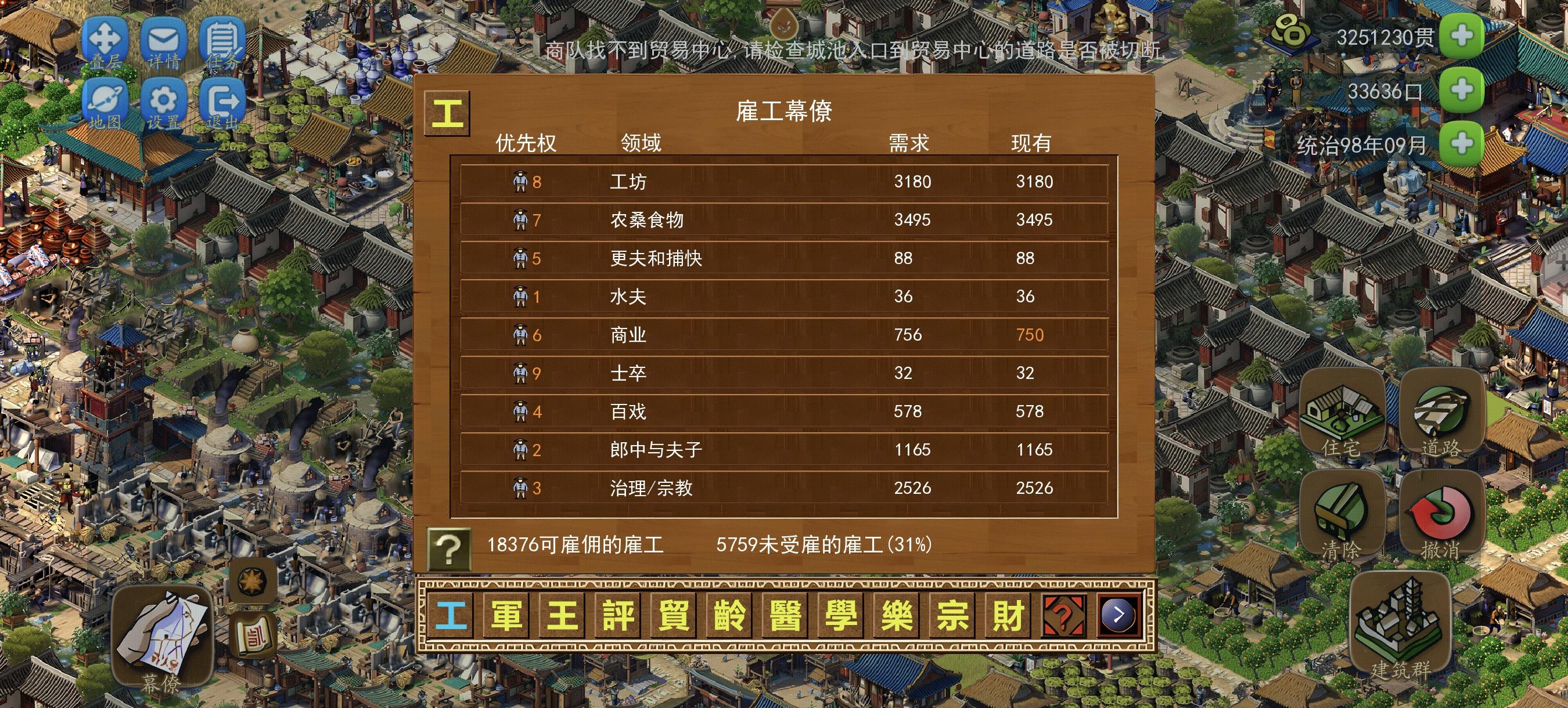 地形小必须用府邸,府邸部分人是不工作的,府邸必须和部分建筑用花圃分隔开有3格以上,府邸要求3种食物4种货物、白纸生产速度最低(哪怕满级效率150%)、没地方做贸易、土匪频繁必须摆兵营、有狼必须围起来不能杀死 否则刷新在居民区