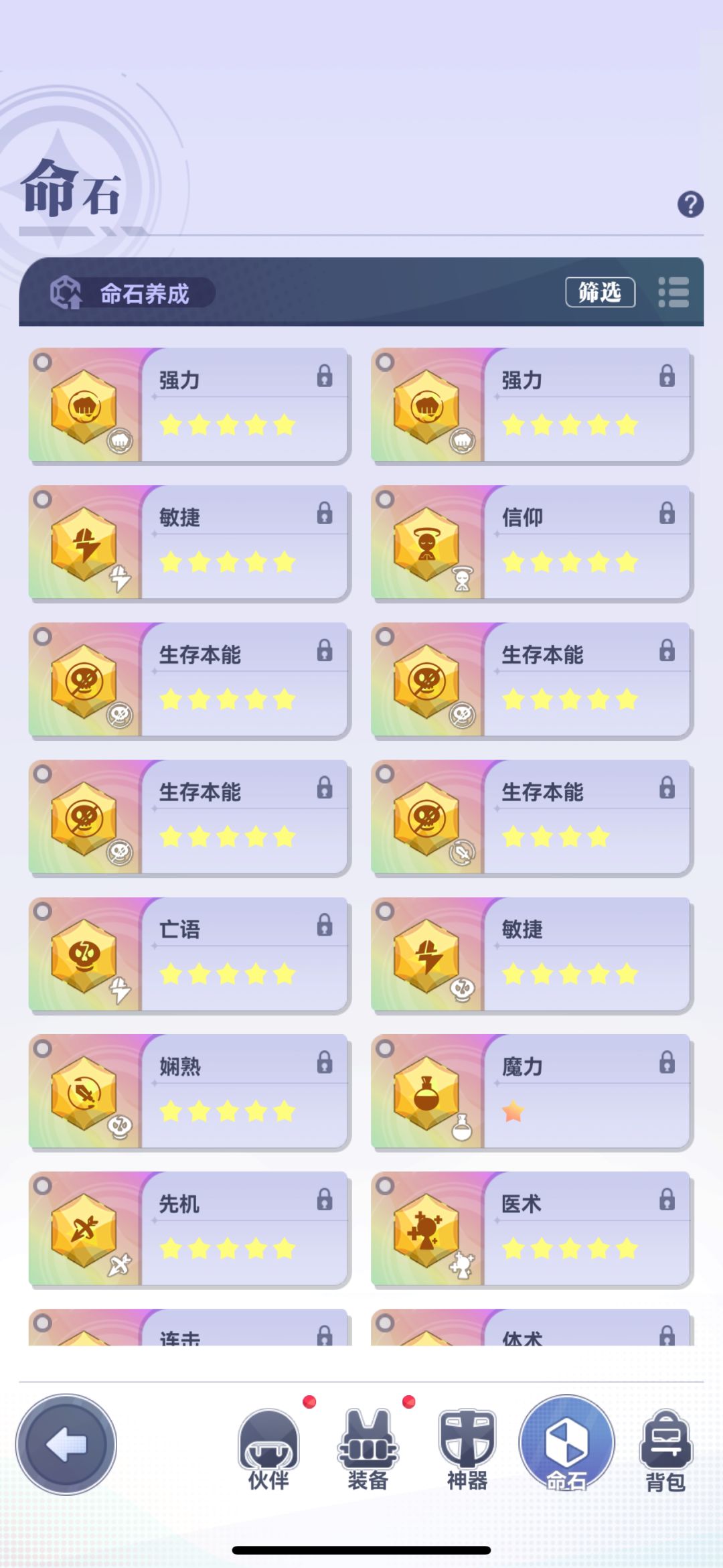 战力这方面就可以参考一下我的配置:星级最高的就是彩练,老余克莱拉老黑都是5星出头,一开始是伙伴、装备等级对点,后来在玩家群中很多大佬的建议下改成单点装备了。装备的话我的彩练只用过增伤,神盾只有一次特殊关卡(有一次被星轸的反伤搞破防了用的)然后前排复活(击飞没用过)后排极速为主,再给射手1~2个击飞套,看个人的想法,这个没有标准答案,词条可以根据自己的资源洗一洗,彩练双攻双暴拉满,前排的复活最少先洗个闪避,资源多的就可以闪避攻速双暴,后排的极速击飞都是命中攻速双暴。命石的话就那几个,生存强力亡语敏捷信仰,其他的基本用不到,魔力一般角色星级上来不用命石都能7。神殿我没有选择梭哈光,在其他神殿都400级后(当时还没有更新600级)才继续拉光,这方面选择也比较多,火水用到的很少可以根据自身情况洗了,暗的话就看用不用老黑了(个人觉得老黑砍树还是很香的),