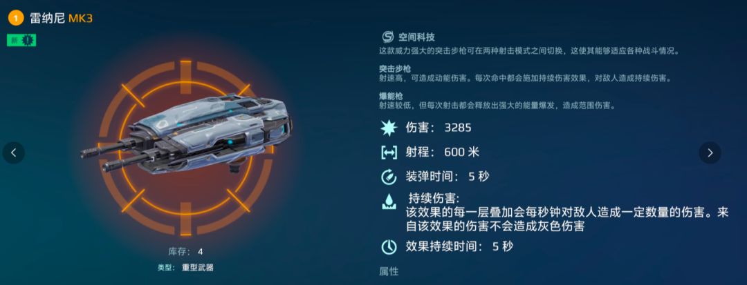 [纳涅阿] 与 [雷纳尼] 均为中程弹夹武器,射程可达 600 米,换弹时间为 5 秒。其中,[纳涅阿] 满级面板伤害为 2345,持续伤害为 234 点 / 秒;[雷纳尼] 满级面板伤害更高,可达 3285,持续伤害为 328 点 / 秒。