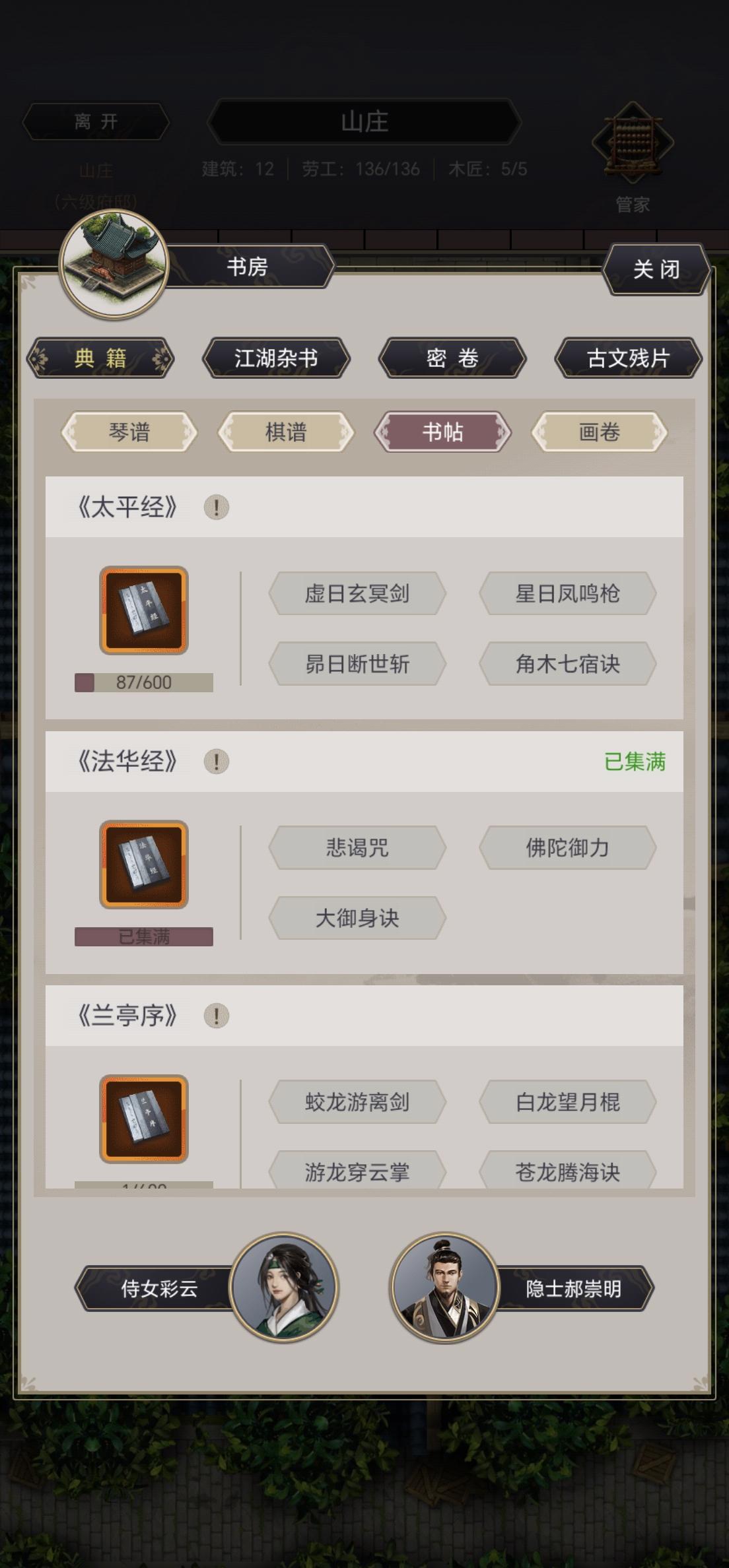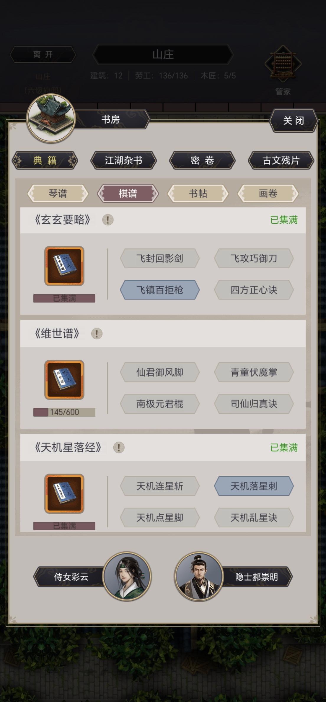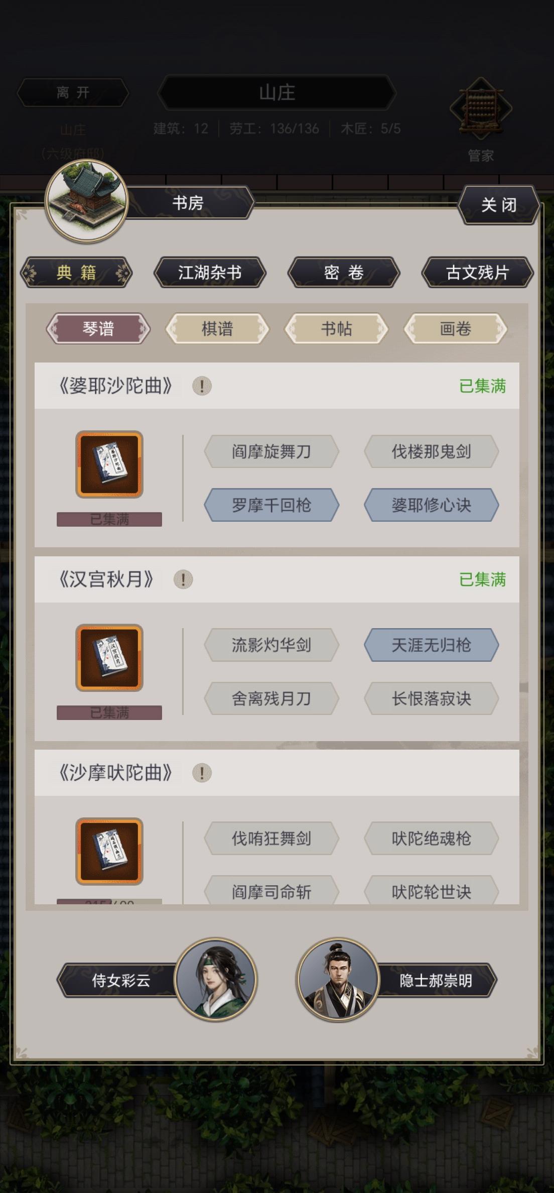 书房橙书好几本了,除了几个主动技能是用玉烧出来的外,被动技能几个月了就出来2个琴的。特别是棋和书,一个没出来。