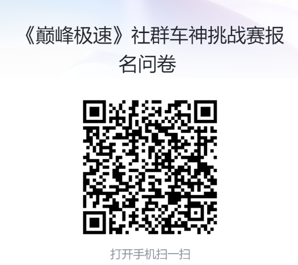 车手们直接扫描下方【社群车神挑战赛报名问卷】二维码,打开后填写问卷,确认信息无误后提交,就能成功报名本次赛事啦!这样就能锁定参赛资格,快人一步坐等开赛赢奖励~