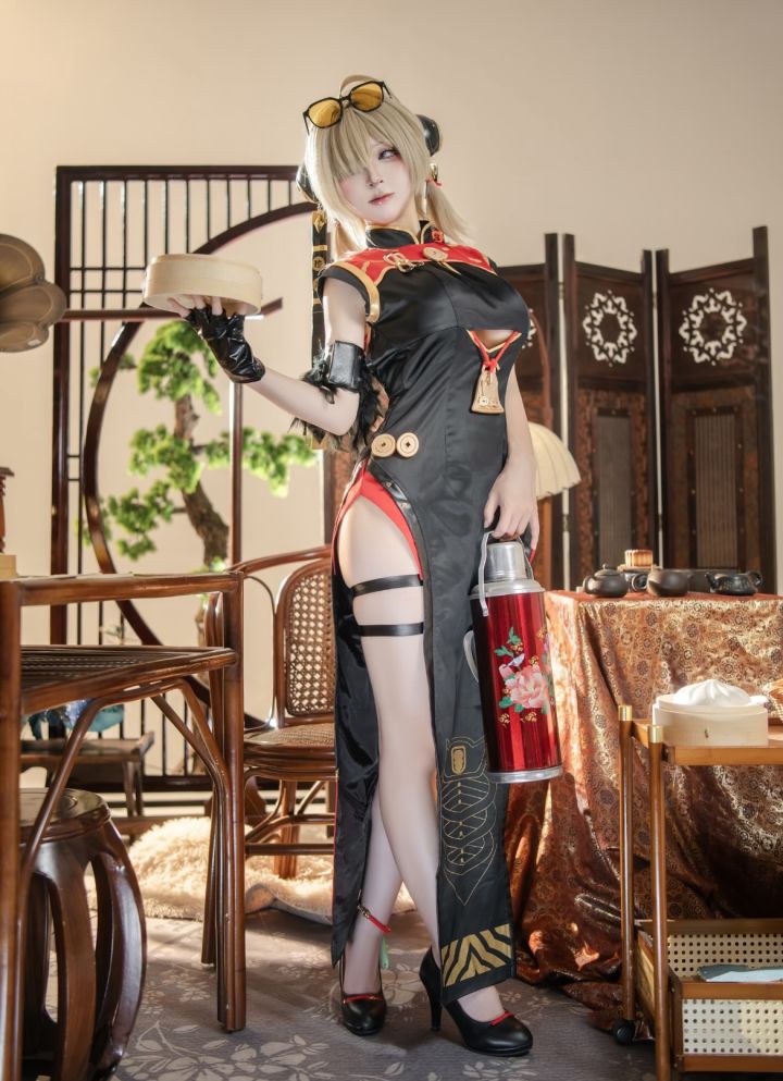 场景布置也格外用心,中式屏风、复古家具与保温壶、包子等道具的搭配,瞬间营造出充满生活气息的国风空间,让角色仿佛真的置身于那个独特的世界。从妆造到场景氛围的营造,每一处都能感受到coser对角色的深刻理解与满满的诚意,这份还原度与氛围感实在太令人心动了!