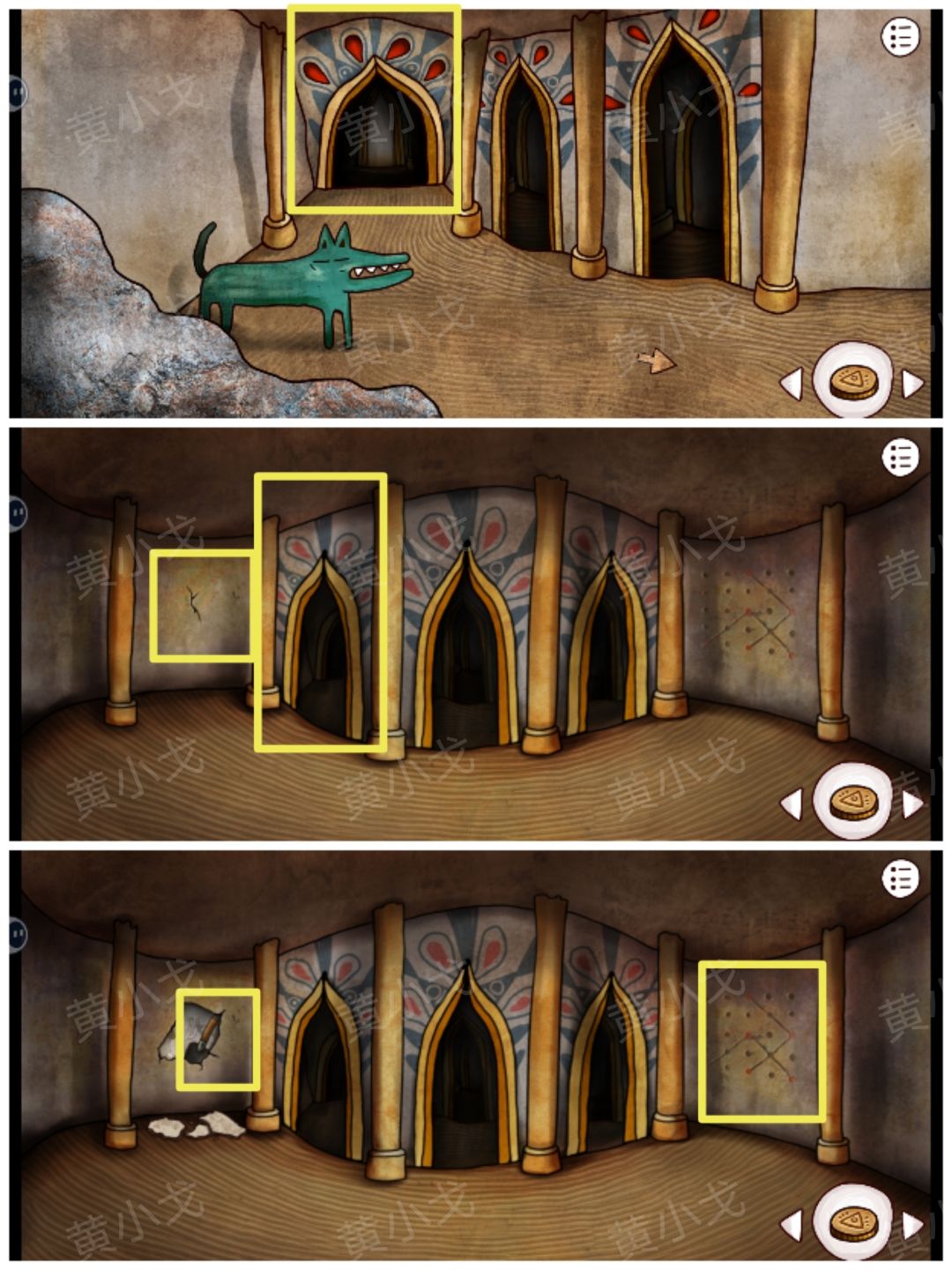 27.点击门上的密码锁,根据[神庙]场景进入门后出现在右侧墙上的图案线索,调整密码锁