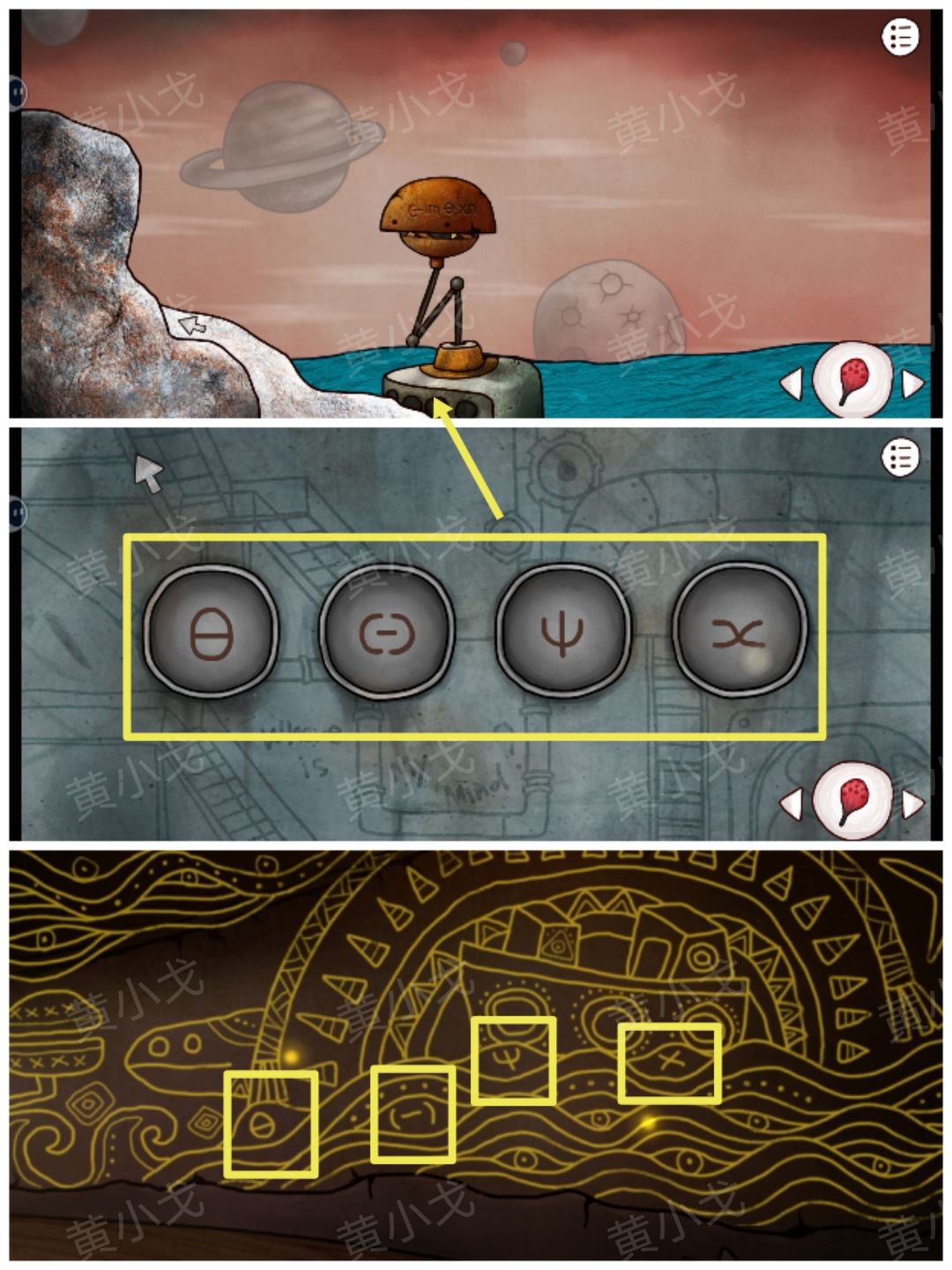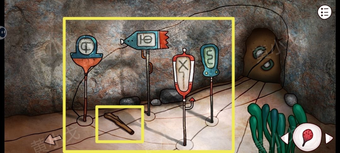 12.点击灯塔指引灯上的密码锁,根据[山洞-神秘空间]壁画上的符号线索,调整密码锁