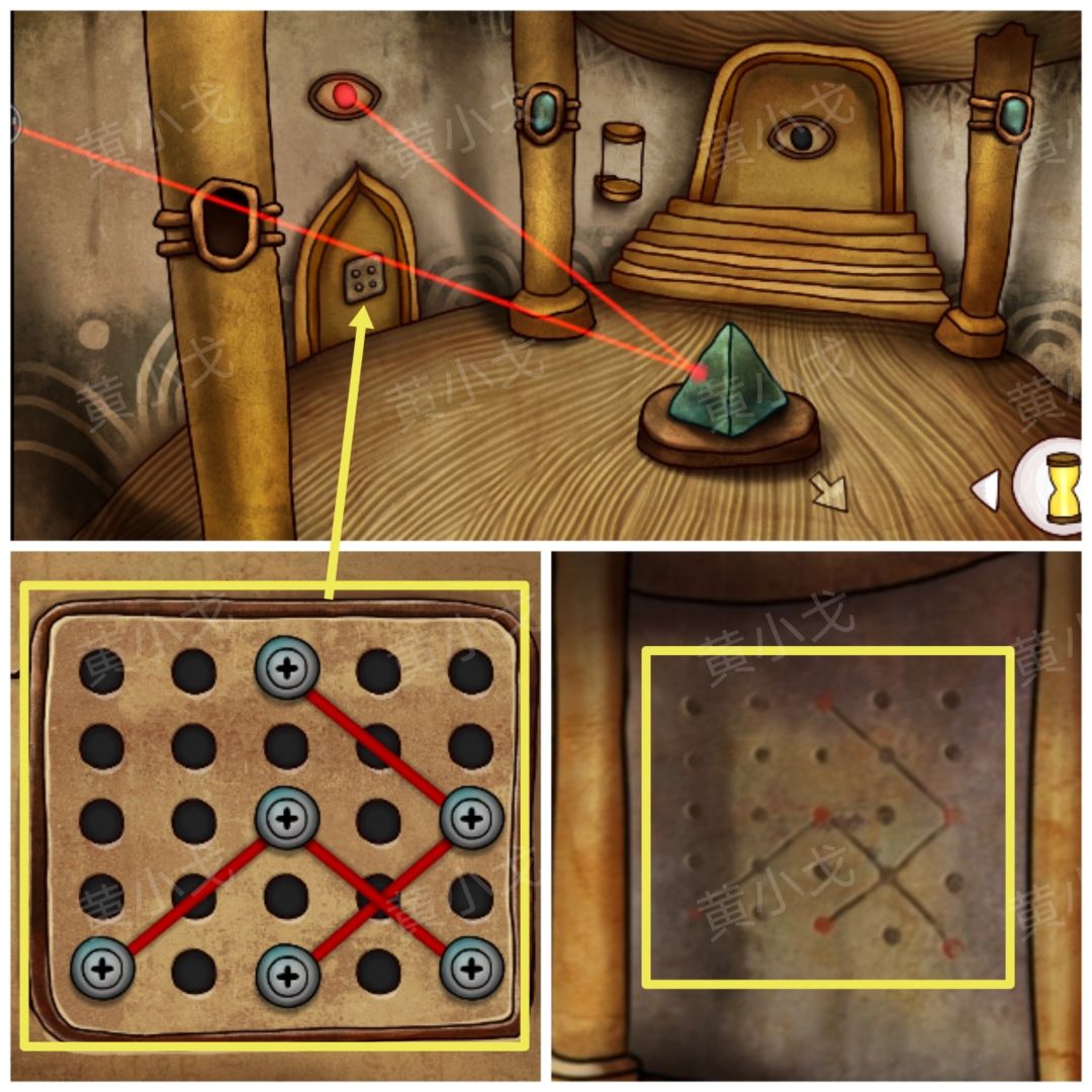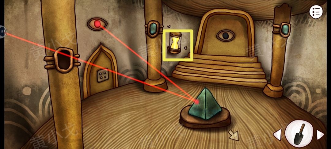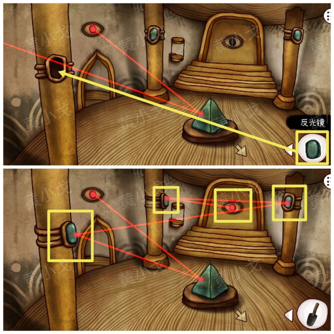 35.把【反光镜】放入神柱上的凹槽中,调整三块反光镜的角度,使激光照到右侧石门上的眼睛中,打开石门