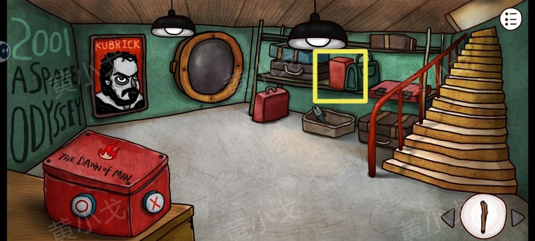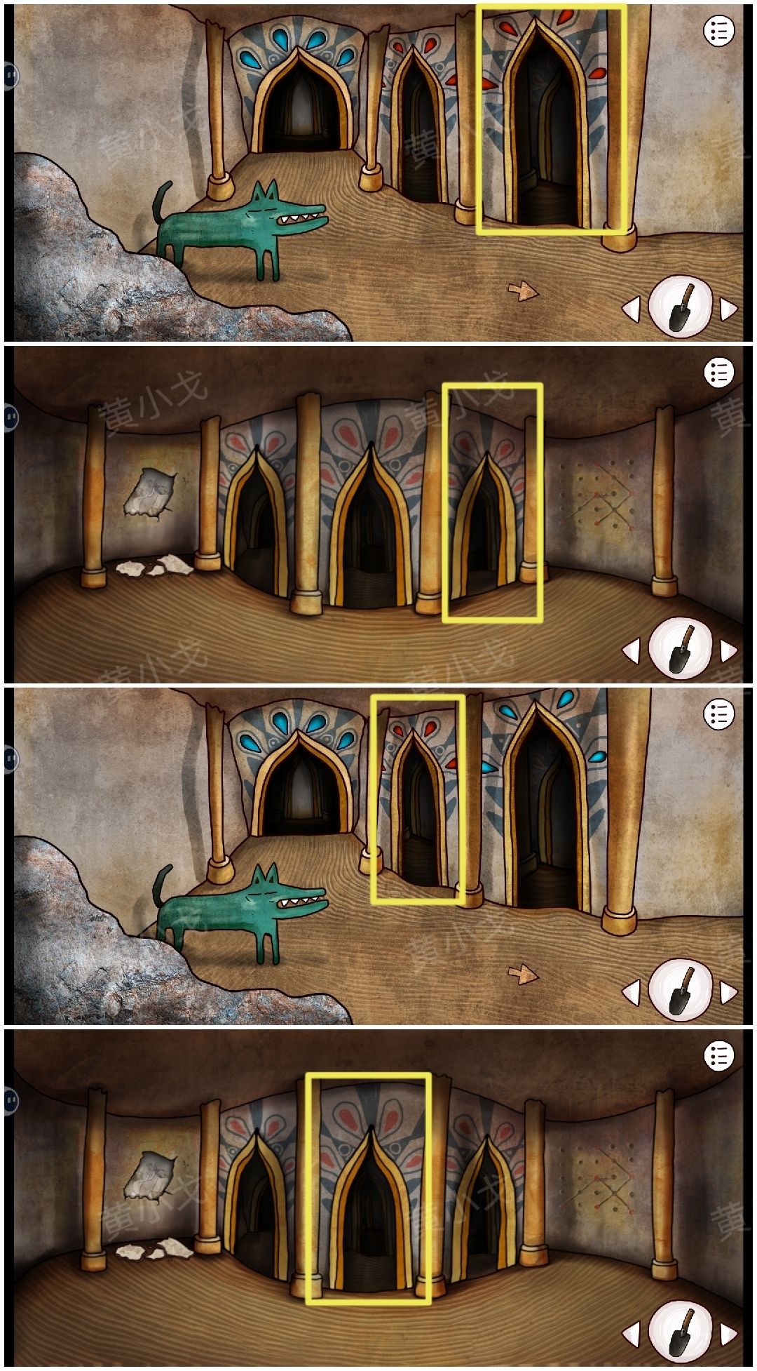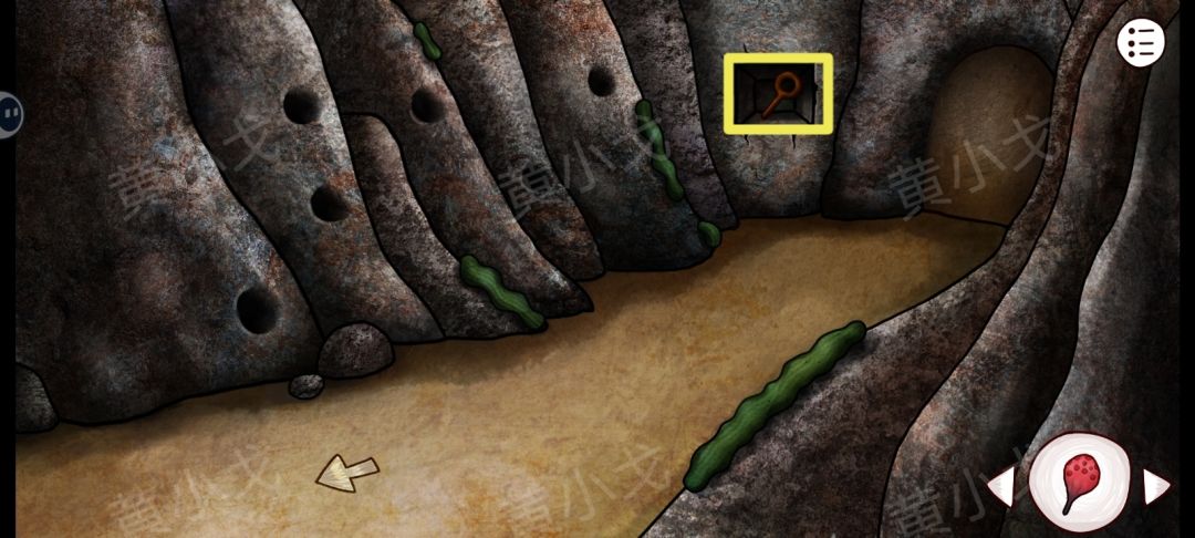 24.进入左侧的门,点击3次左侧墙上的裂缝,获得【铲子】,然后从左侧门出来,门上的灯会变成蓝色