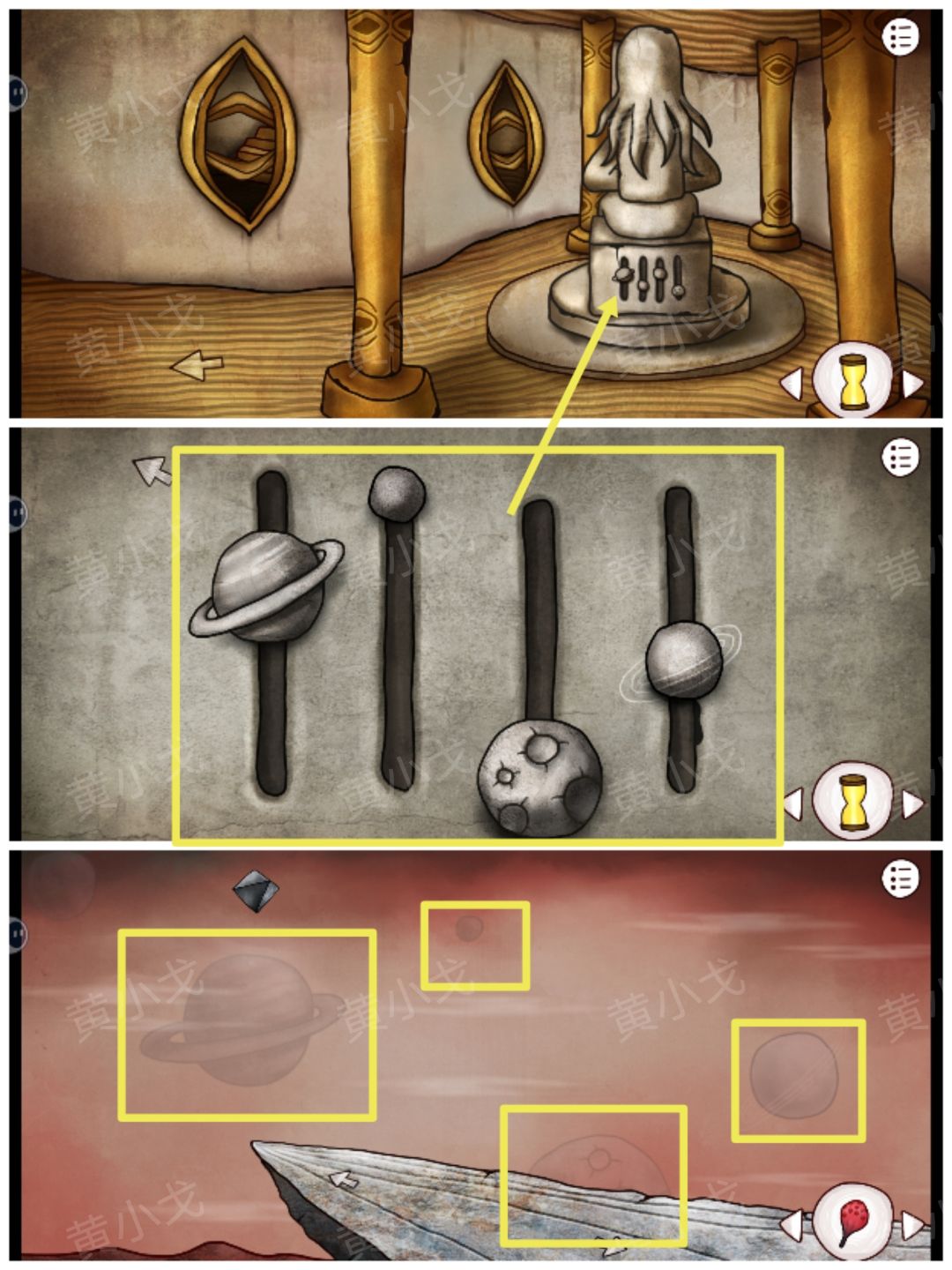 28.点击雕像底座上的机关,根据上面的星球形状提示,结合[飞船]场景对应形状星球的位置,调整密码锁