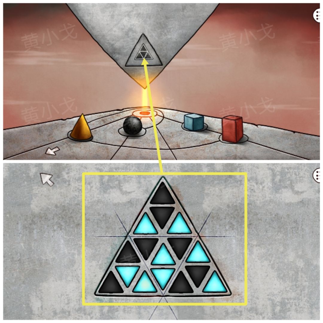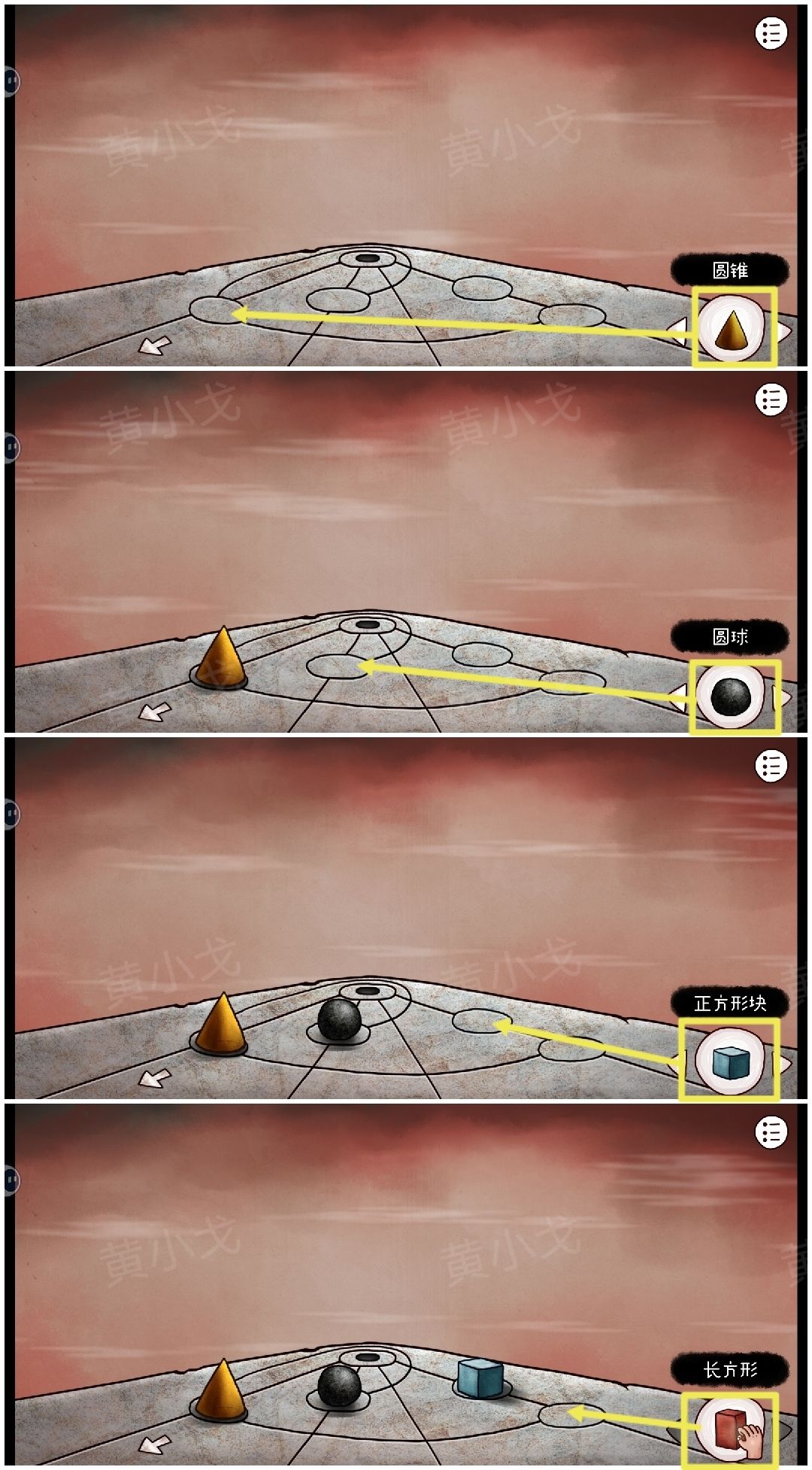 5.根据[山洞外]路牌的位置及上面的符号和[船甲板]机器上的图案线索,把【圆锥】、【正方形块】、【圆球】和【长方形】放到正确的位置上,召唤飞船