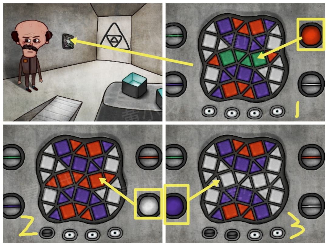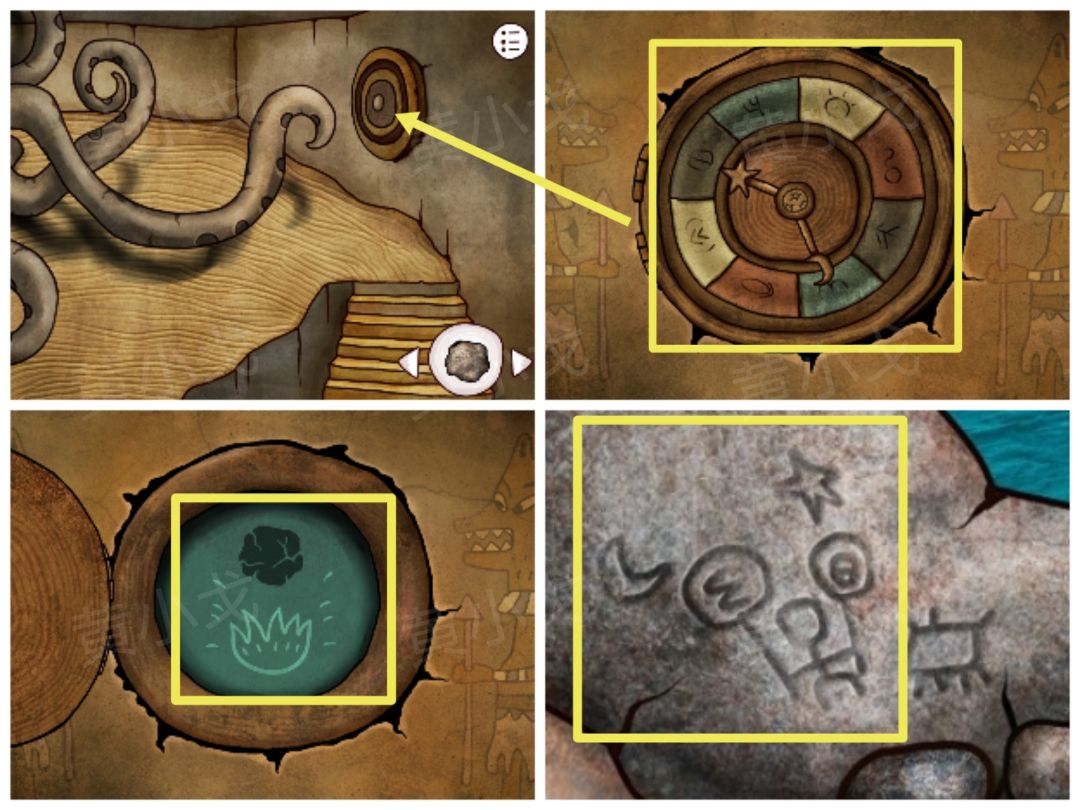 2.点击墙上的机关,根据指针的形状提示,结合[海边]场景石头上的图案线索,调整指针至对应的图案;打开机关,获得线索