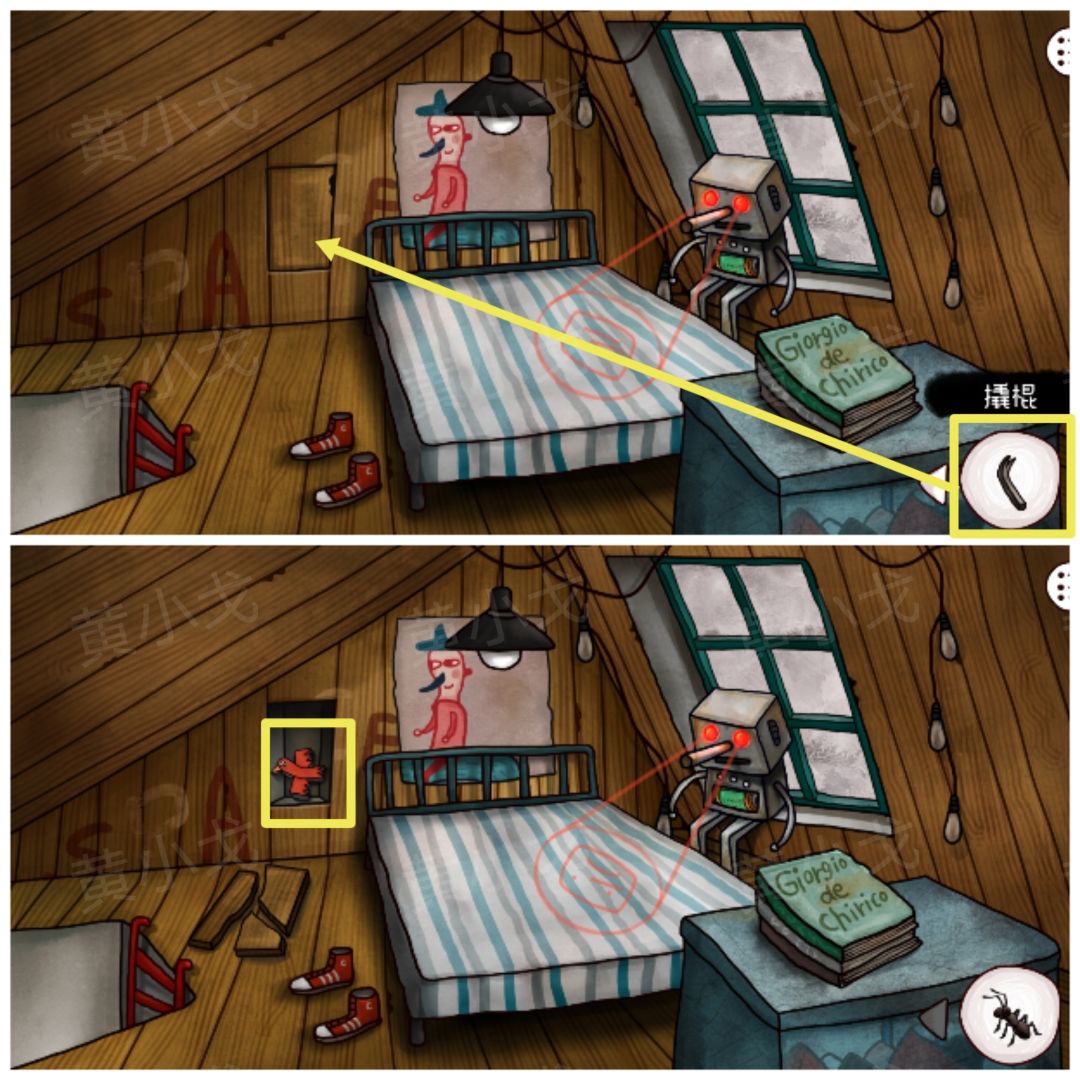 22.点击柜子上的密码锁,根据按钮上的图案,结合[阁楼]场景机器人投影在床上的图案及顺序,按顺序按下按钮;打开柜子,获得【未冲洗的胶卷】