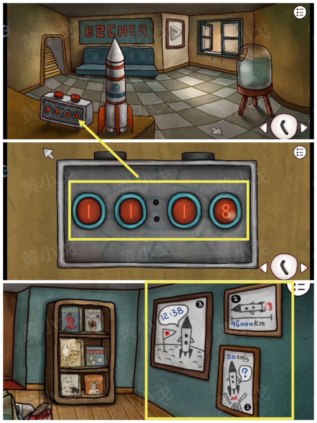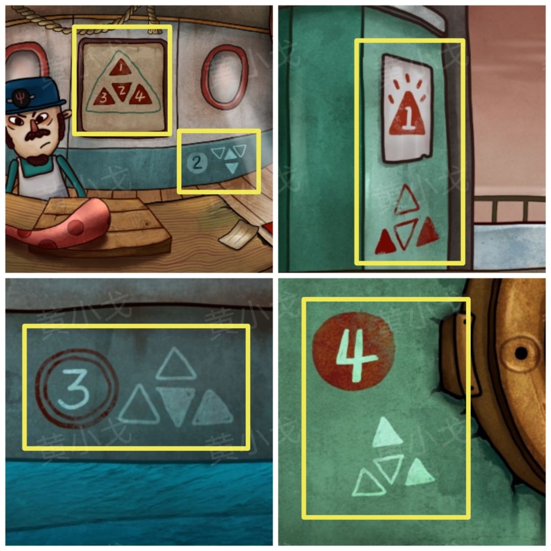 6.点击飞船门上的机关,根据[船]、[船舱上层]、[底层船舱]和[船甲板]场景出现的数字和图案线索,调整密码锁,打开飞船的门