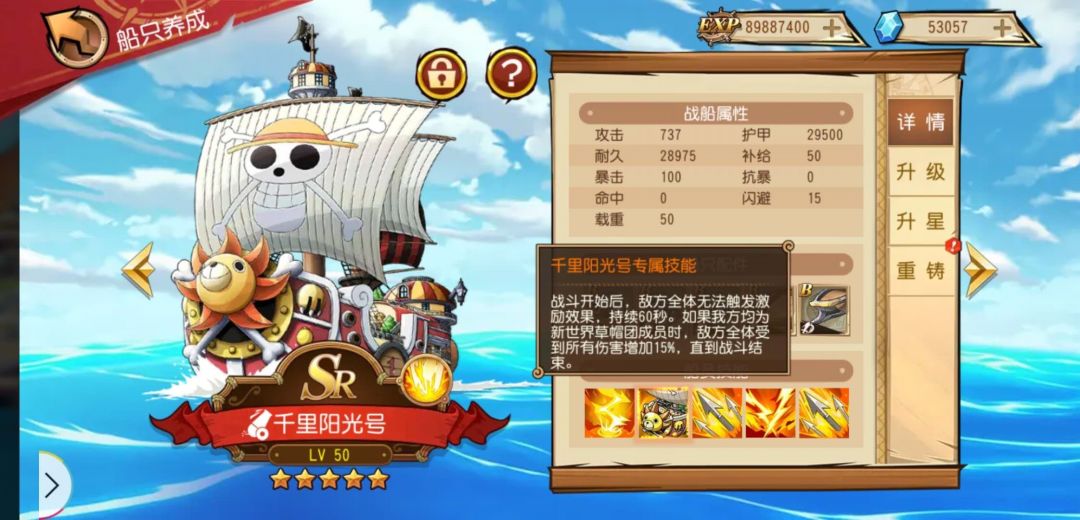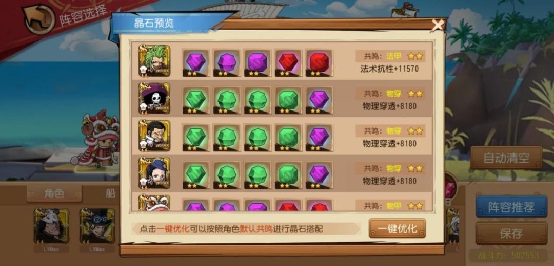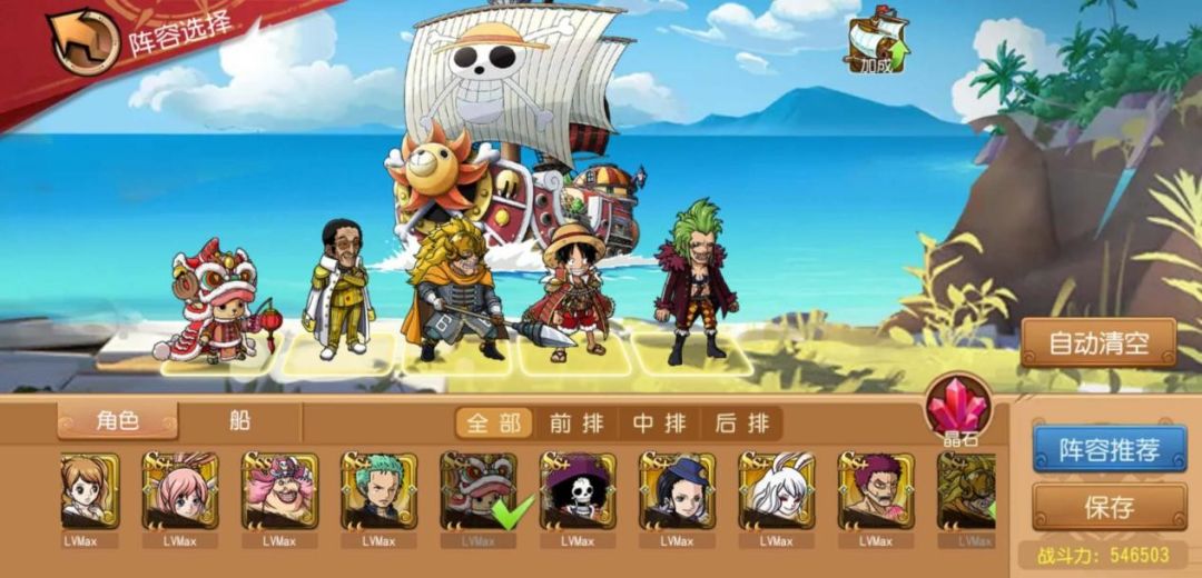 ①主流最佳阵容:突破新世界·乔巴(物甲)+突破新世界·罗宾(物穿)+藤虎(物穿)+突破新世界·布鲁克(物穿)+巴尔托洛梅奥(法甲)【船技:千里阳光号】