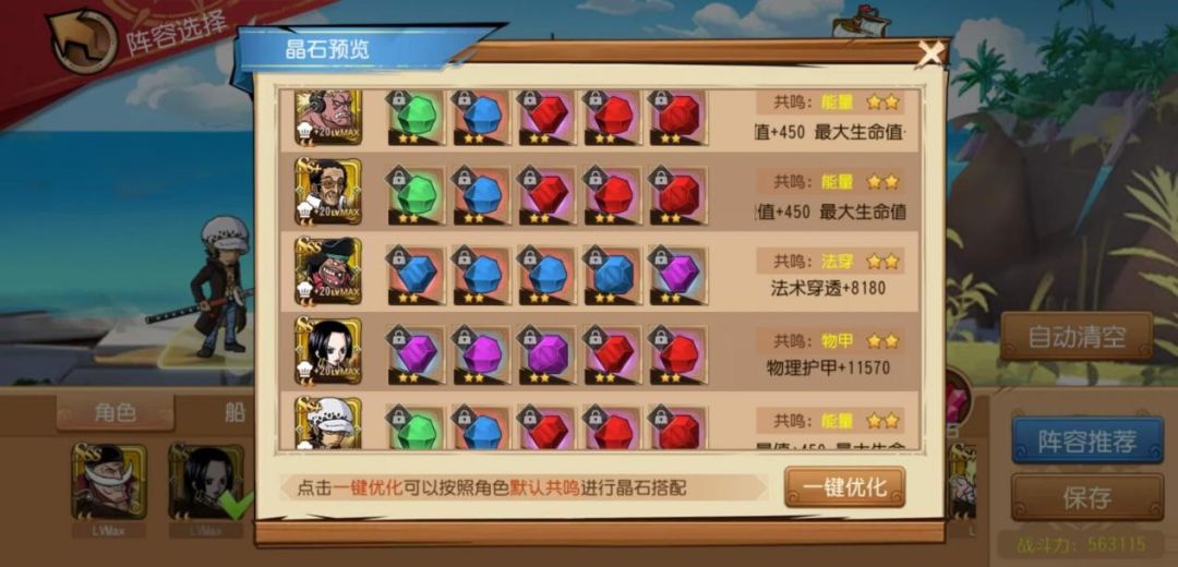 以上所示阵容来说,除了罗之外其余均需以钻石进行兑换。领地岛宝箱有稳定几率的罗角色碎片及专属来源,以笔者自身为例,多年的老玩家积极参与活动基本都能突破罗角色及达到红色专属级别。其余四卡均需以钻石进行兑换,顶级的汉库珂与甚平的性价比不相上下,玩家坚持兑换皆能达到高配置。在该阵容的情况下,巴雷特投入巨大,尽量能拥有五级专属珠宝及该角色专属船,其余黑胡子、汉库珂、罗、黄猿的突破技能数值取决于其突破等级,无特定等级的限定,以玩家自身的资源条件出发、顾越高越好。