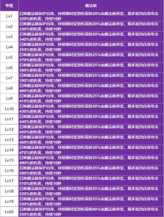 - 定位:核心生存技能,释放期间受到伤害的一定比例由护盾承受,成长性高。