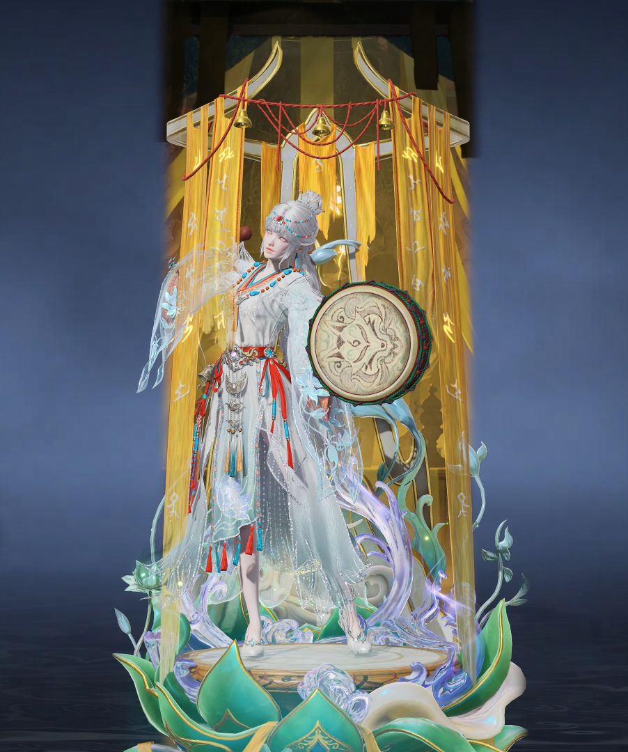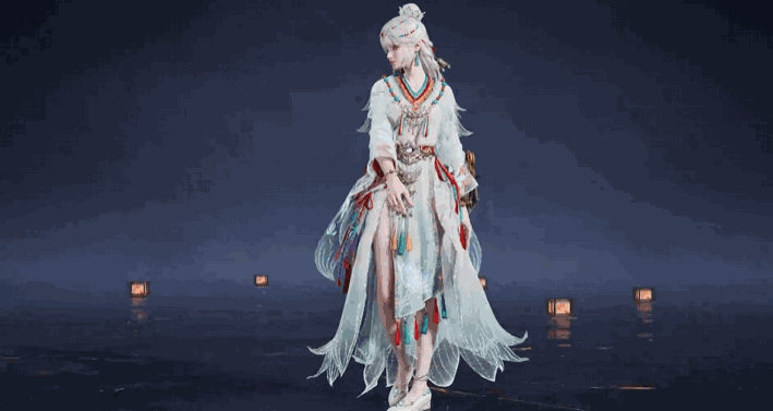 青白色的衣裙上点缀着红、青、黄等鲜艳色彩的装饰,增添了一丝灵动。胸口、裙摆处的设计状若莲花,仙气飘飘。