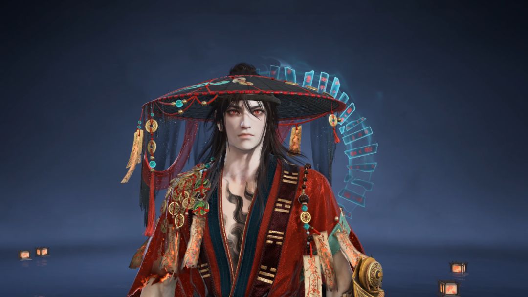一袭红黑道袍像被焚烧过,肩膀、腰间挂着红绳串着的铜钱和符纸,衣摆绣着火焰纹样,还发散出似墨水般的黑色雾气,处处透露着诡异。