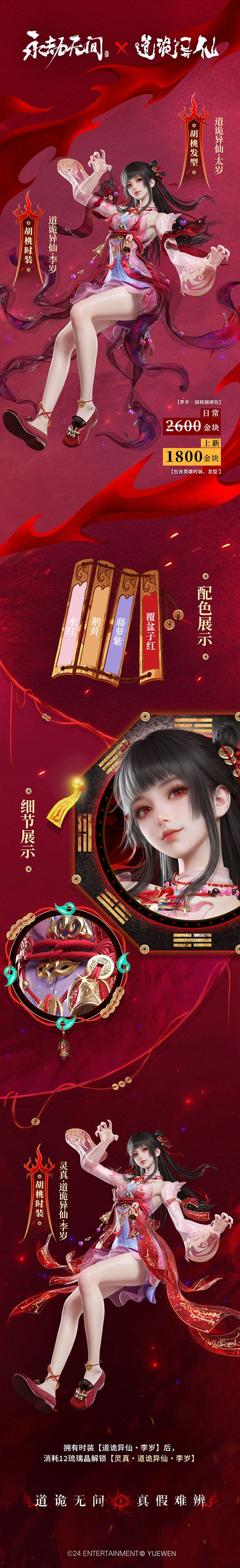 消耗12琉璃晶即可解锁升级版外观【灵真·道诡异仙·李岁】,暗红色状似触手的飘带变成绣着金色符文的飘带。