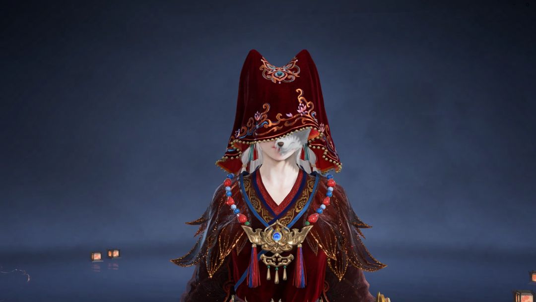 红衣少女头上盖着拥有精致花纹的红盖头,白色狐狸面具遮住了半边的脸。