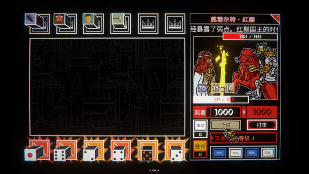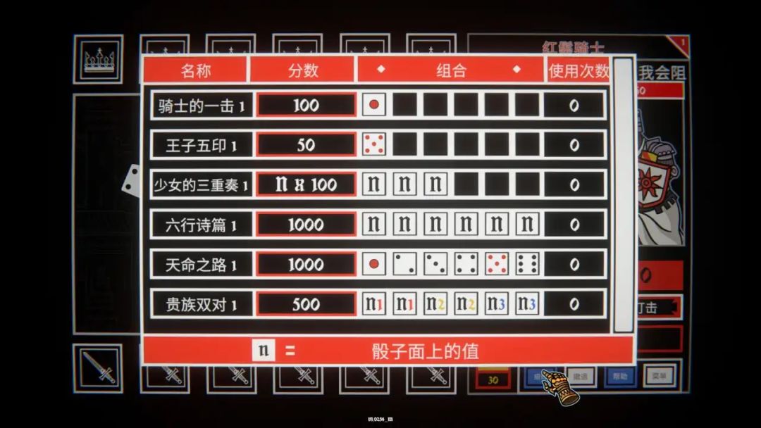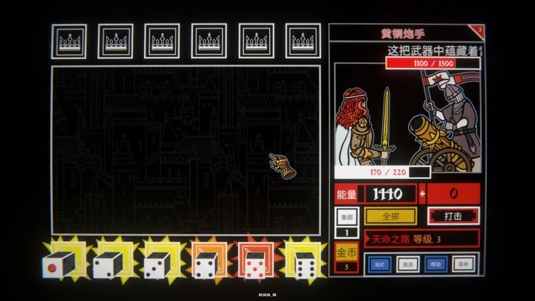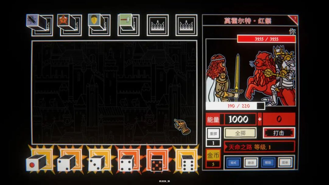 在玩家的下方有6个宝剑形状的空格,对应可以放6个骰子。玩家每回合都可以投掷骰子来形成各种组合,这个组合你可以粗暴理解为类似《小丑牌》中的牌型,非组合外的形式都无法获得任何能量。不过比较骰子只有6个点数面,相对来说组合数量就较为有限。举个例子:单个1点可以形成“骑士的一击”,单个5点则为“王子王印”,3个一样的点是“少女的三重奏”,6个一样的点可以形成强大的“六行诗篇”等等。