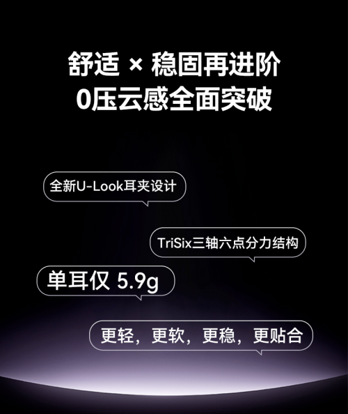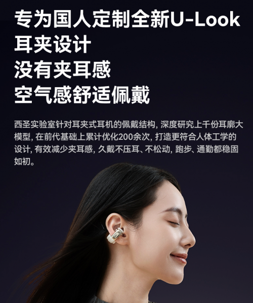 革新TriSix联合U-Look开创国人耳型专属舒适极限—树立0压云感标杆!在耳夹式耳机长期存在“夹耳感、易滑落、佩戴疲劳”的痛点,所以西圣实现了佩戴体验的全面升级,西圣通过TriSix三轴六点分力结构,将受力精确分布于耳廓六个关键位置,每个佩戴角度都能动态分担压力,解决行业普遍存在的滑落和压耳问题,让耳机稳固不夹耳,相比市面上常见的单点夹力设计,使运动佩戴更稳、压力更均衡!