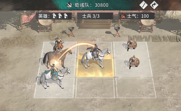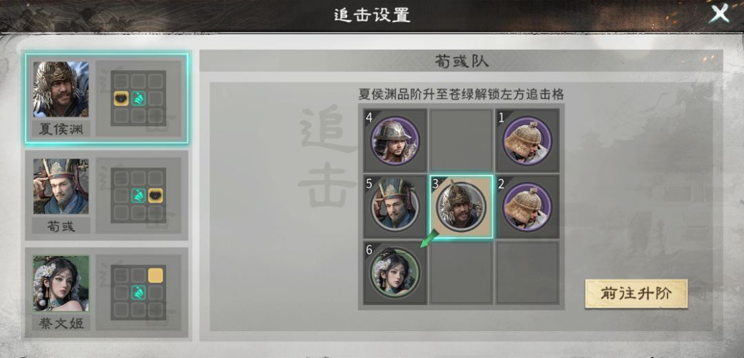 队伍核心思路:蔡文姬为张辽提供余音效果,额外触发张辽追击技能,荀彧追击格为右方可以定向给张辽提供增伤以及坦度。