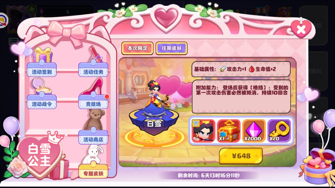 在这个界面,就可以直接购买我们美美的白雪公主啦,不仅美丽,且强大!!往期皮肤--小丑也同步返场哦~心怡的冒险家可别再错过了!!!