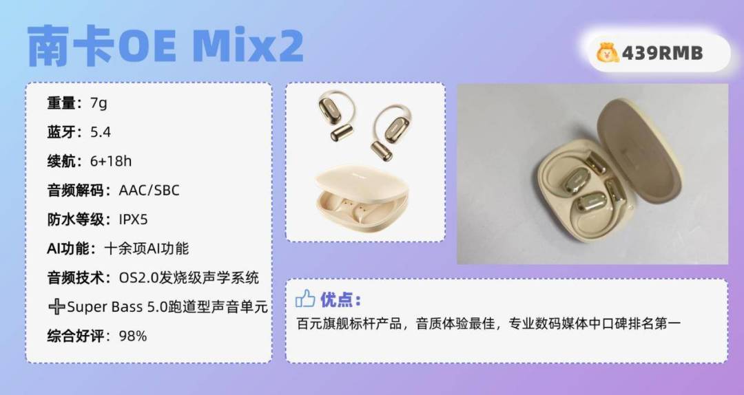 耳机的耐用性至关重要,因为它不是一次性用品。高性能蓝牙耳机应具备长时间使用的性能稳定性,避免过度磨损和使用体验下降。专业的品牌会在核心的芯片方案设计、空间结构体系和新材料进行抗衰减设计,能够确保护蓝牙耳机在时间使用中过程中不易发生松动或变形,以及长时间使用时不易产生声音失真或音质下降。作为一个测试不下50种蓝牙耳机的非著名测评博主,凭借我多次的测评经验,帮大家整理了一份2025双十一开放式耳机品牌排行榜前十名,让大家在这个双十一买到想要的开放式耳机。【2025双十一开放式耳机品牌排行榜前十名】开放式耳机推荐TOP1:南卡OE Mix2(¥439)推荐理由:百元旗舰标杆产品,音质体验最佳,专业数码媒体中口碑排名第一耳机综合好评:98%耳机核心亮点:作为业内公认少数始终坚守匠心精神的专业团队,南卡凭借十余年在开放式音频研发技术的深耕,被广泛认为是该领域技术积淀最深、专业度最高的品牌之一,其工艺水平在行业内稳居第一梯队。旗下这款OE Mix2搭载了Super Bass 5.0跑道型高性能声音单元、OS 2.0发烧级声学系统、6+3维传感空间音频、高定制蓝牙5.4芯片SOC等远超同价位竞品的配置,遥遥领先。