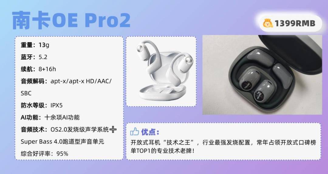 其他方面:音质方面,小米开放式耳机pro搭配1813超大动圈单元,采用高分子复合振膜,内外双磁设计,让低音更加澎湃。并且首次应用HIFI级双动铁单元,让高音更清晰。同时升级LHDC5.0,无损音质传输,细节还原真实。此外,还提供三种小米自研调音模式,力成多种曼妙听感。独立防漏音系统,保护隐私,安心畅听。配置方面,小米开放式耳机pro支持蓝牙5.4,同时耳机支持独立录音,关盒录音。续航方面,单体耳机续航长达8.5h,搭配充电盒续航可达45h。除此以外,小米开放式耳机Pro还支持独立录音和AI实时翻译功能,对于小米生态用户会比较友好。开放式耳机推荐TOP5:南卡OE Pro2(¥1399)推荐理由:行业最强发烧配置,常年占领开放式口碑榜单TOP1的专业技术老牌!耳机综合好评:95%耳机核心亮点:作为一家深耕音频领域的专业品牌,南卡一直以音质与舒适度为王,OE Pro2更被称为该品类中“最能打”的代表。在两千元内的价格区间,它凭借自研单元、先进声学系统和完善的配置体验,展现出远超同级的实力,赢得HiFi发烧友和媒体的高度认可。另外,OE Pro2还整合了全能Ai智慧系统,支持翻译、对话、搜索、创作等多场景应用,凭借 “全能智慧助手 + 音质巅峰” 的双重优势,OE Pro2成为开放式耳机圈内的公认旗舰!