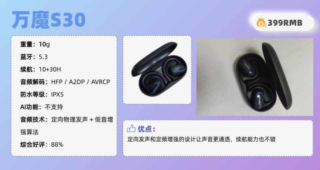 配置方面,在生产制造过程中,南卡严格执行了超过30道工序,从选材、切割、定型、研磨等方面严格挑选,只有最优质的成品才被采用,从而大幅提高了产品的质量水平。也正式因为如此高品质的要求,使其做到了使用两年情况下性能衰减不到5%,在专业性和可靠性上都远超行业平均水平。这款南卡OE Mix 2配备了最先进的蓝牙5.4芯片SOC,性能进一步提升通讯效率与抗干扰性,达到秒连、秒响应,SOC,享受到更快的数据传输速度和更稳定的连接。延迟更低,始终做到音画同步。而且通话清晰度也是非常高的,在双麦智能通话降噪的加持下,能够更好地消除通话时多频段的环境噪音,让通话始终保持清晰自如。另外还拥有IPX5级防水、24H全天续航、十余项AI能力等功能,使得南卡OE Mix2性价比远超同类竞品,甚至可以媲美千元旗舰机型,是今年当之无愧的百元最佳开放式耳机性价比之选。开放式耳机推荐TOP2:万 魔S30(¥399)推荐理由:定向发声和定频增强的设计让声音更通透,续航能力也不错耳机综合好评:88%耳机核心亮点:分体式耳机设计稳固佩戴,定向发声和低频增强算法设计声音更集中传输,人声表现更通透自然,搭配ENC通话降噪功能保证在嘈杂环境下通话清晰