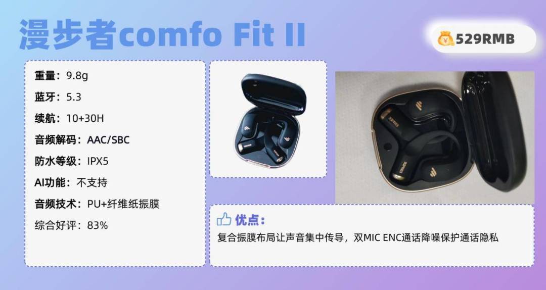 其他方面:音质方面,Oladance OWS PRO搭载23x10mm声音单元,搭配超线性复合喇叭,采用全新振膜结构升级聆听体验,增强3D立体音效,同时六麦克风降噪,有效降低噪音,保证耳道声音纯净、通话正常进行。配置方面,Oladance OWS PRO支持蓝牙5.3,连接更加稳定、迅速,支持多点连接。此外在续航方面也不错,单词续航最高可达16h,搭配充电舱续航可达58h。开放式耳机推荐TOP10:漫步者Comfo Fit II(¥529)推荐理由:复合振膜布局让声音集中传导,双MIC ENC通话降噪保护通话隐私耳机综合好评:83%耳机核心亮点:符合人体工学设计,液态硅胶材质,触感舒适减少耳部皮肤损伤,单体耳机重量约为9.8g。搭载新型高驱动大动态声学单元加上Pu+纤维纸复合振膜布局,配合耳甲腔稳定结构让声音更集中传导。