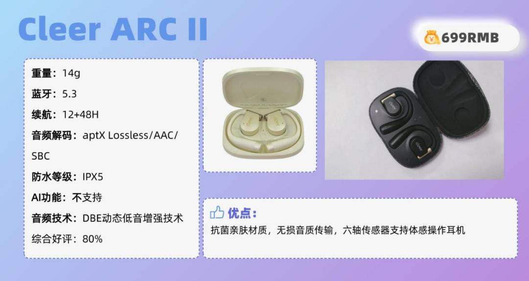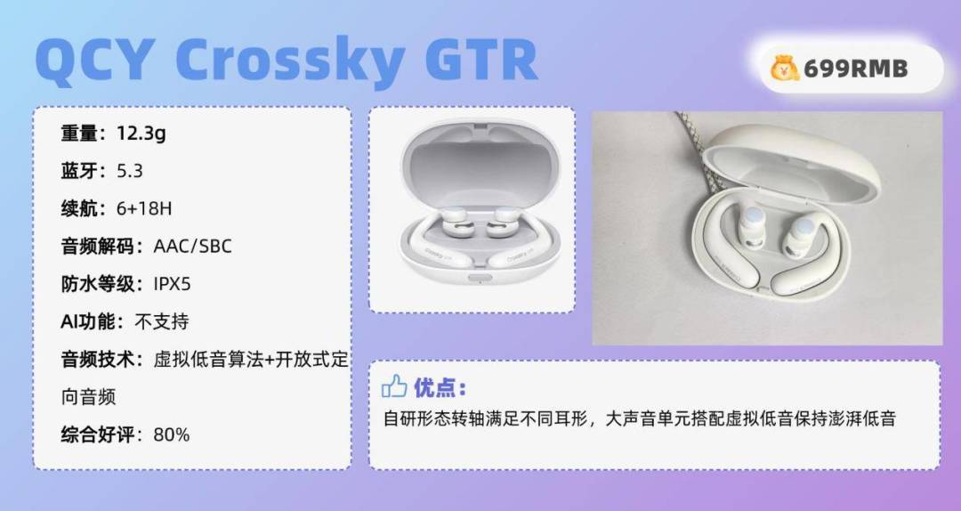 其他方面:音质方面,Cleer ARC II搭配16.2mm,全新的aptX Lossless无损音频传输,高速处理声音。搭配DBE专业动态低音增加技术,智能动态调节低频信号的增益大小,享受浑厚低音。内置六轴传感器,实现体感操作耳机,运动跌倒提醒,智能防丢的特有功能。配置方面,Cleer ARC II支持蓝牙5.3,多设备蓝牙双连接,实现无缝切换。同时近4倍更高码率蓝牙传输码,2倍够狠更高宽带,音符原声无损聆听。续航方面,单只耳机巡航8h,搭配充电舱巡航可达35h。开放式耳机推荐TOP7:Q CY Cross ky GTR(¥699)推荐理由:自研形态转轴满足不同耳形,大声音单元搭配虚拟低音保持澎湃低音耳机综合好评:80%耳机核心亮点:自研无人机形态转轴,满足不同耳形,结合几何学的支撑原理,分散耳背压力。搭载17X12mm声音单元,搭配虚拟低音算法,开放式定向音频技术,利用人听觉系统的特性,通过算法处理音质,保持澎湃听感。