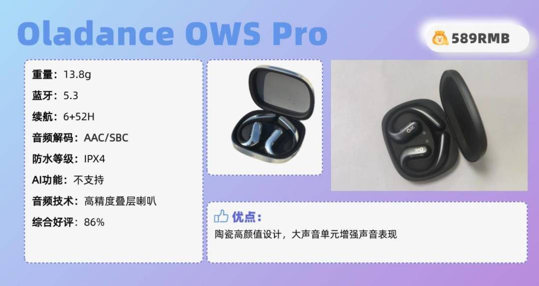 其他方面:音质方面,开石OpenRock Pro搭载TubeBass低频增强技术加持,采用16.2mm大动态重低音扬声器,配合LISO算法的声学设计,提供强劲低音效果。四唛通话降噪+高通CVC8.0技术,高效消除环境噪音,保证嘈杂环境中通话的正常进行。配置方面,开石OpenRock Pro支持蓝牙5.2,传输更高效、快捷。续航方面,单次续航可达19h,搭配耳机仓续航可长达46h,同时搭配疾速快充,充电5分钟,听音1h,相较于其他耳机,续航时间较长,适合对耳机续航时长有要求的小伙伴。开放式耳机推荐TOP9:Oladance OWS PRO(¥589)推荐理由:陶瓷高颜值设计,大声音单元增强声音表现耳机综合好评:86%耳机核心亮点:Oladance OWS PRO柔软亲肤硅胶材质,搭配陶瓷皮肤,时尚度拉满!符合莫比乌斯环人体工学设计,全天舒适牢靠贴合。23x10mm声音单元,搭配超线性复合喇叭,增强3D立体音效。