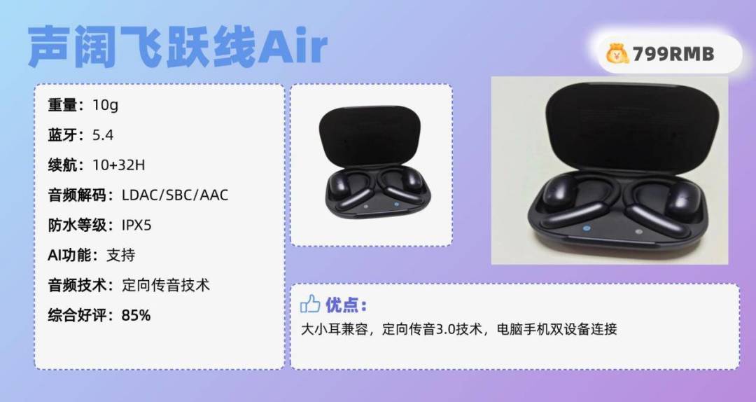 其他方面:音质方面,万魔S30搭载了14.2mm振膜动圈单元,搭配定向发声和低频增强算法的设计,让声音传输更加集中一些,防漏音效果会好一些,人声表现通透自然,高频部分保留了一定的亮度和空间感,细节部分解析中规中矩,而且低频部分量感也不是很足,对于节奏型的音乐缺乏一定的下潜力和冲击力,比较适合不喜欢重低音的小伙伴。配置方面,万魔S30支持蓝牙5.3,连接更加稳定、迅速,日常使用场景下延迟控制得当,而且能够与大部分设备兼容。而且还配备了ENC通话降噪功能,通过双麦阵列智能拾音,削弱环境噪音,在嘈杂的环境下通话依旧能够保持清晰的状态。续航方面的表现也还不错,单耳可以使用10小时,配合充电盒可以轻松使用30小时。开放式耳机推荐TOP3:声 阔飞跃线Air(¥799)推荐理由:大小耳兼容,定向传音3.0技术,电脑手机双设备连接耳机综合好评:85%耳机核心亮点:softcore动态云弧耳挂,大小耳兼容,单只耳机重量为10g。配备定向传音3.0技术,搭配后腔泄气漏斗设计,精准控制减弱声波,避免声音泄露。蓝牙5.4,迅速配对,同时支持手机电脑双设备连接。