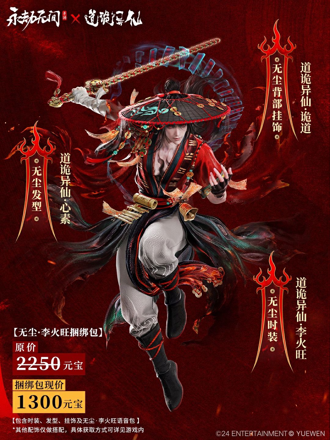 1、新增无尘捆绑包【李火旺捆绑包】。捆绑包内含无尘极品时装【道诡异仙·李火旺】、无尘极品发型【道诡异仙·心素】、无尘极品挂饰【道诡异仙·诡道】、无尘语音包【无尘·李火旺语音包】。捆绑包原价2250元宝,折扣价1300元宝。单独购买对应单品即可享受折扣,购买捆绑包将享受更多折扣。
