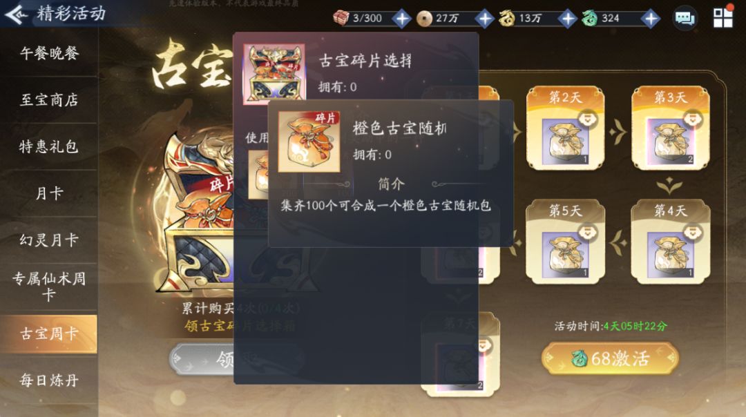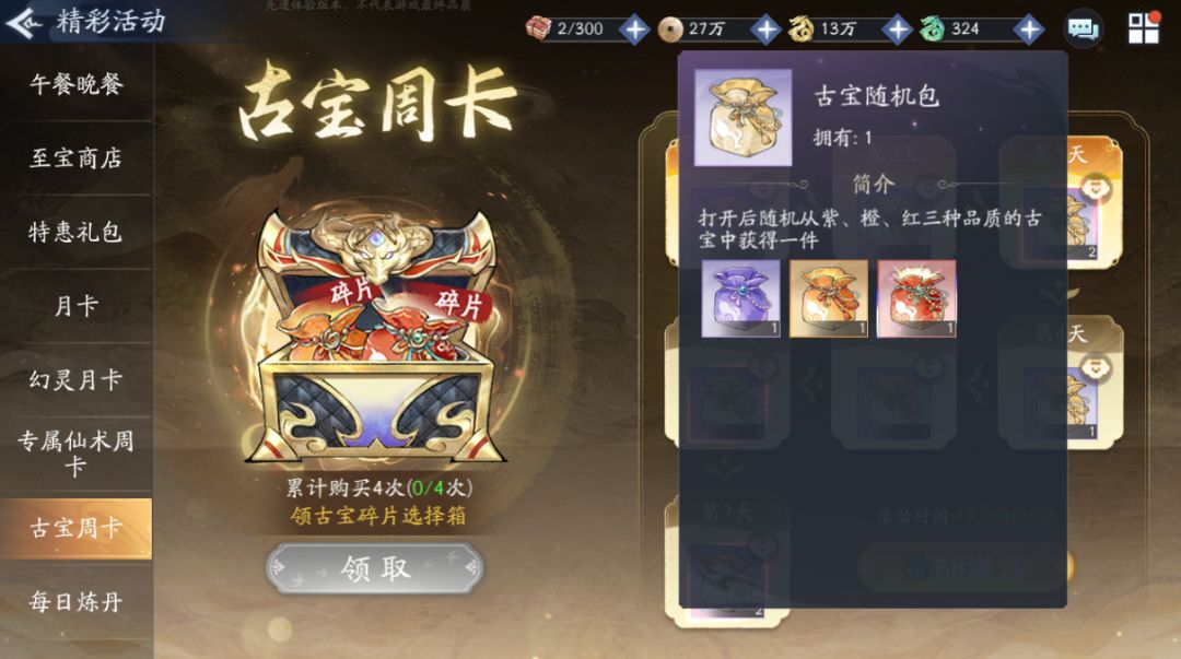 古宝周卡累计购买4次,即68*4=272玉龙(即1个月),可获得古宝碎片选择箱*1