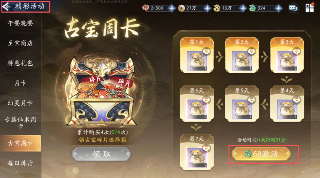在精彩活动界面,每周氪金68玉龙,方可解锁古宝周卡