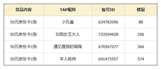 恭喜以下取经人获奖!请在活动结束后的7个自然日内提供自己的TAPTAP个人主页截图(需包含ID)发送至官方邮件:484559154@qq.com,并附上中奖截图,奖品将在活动结束后的30个自然日内发放(京东卡为电子卡~)