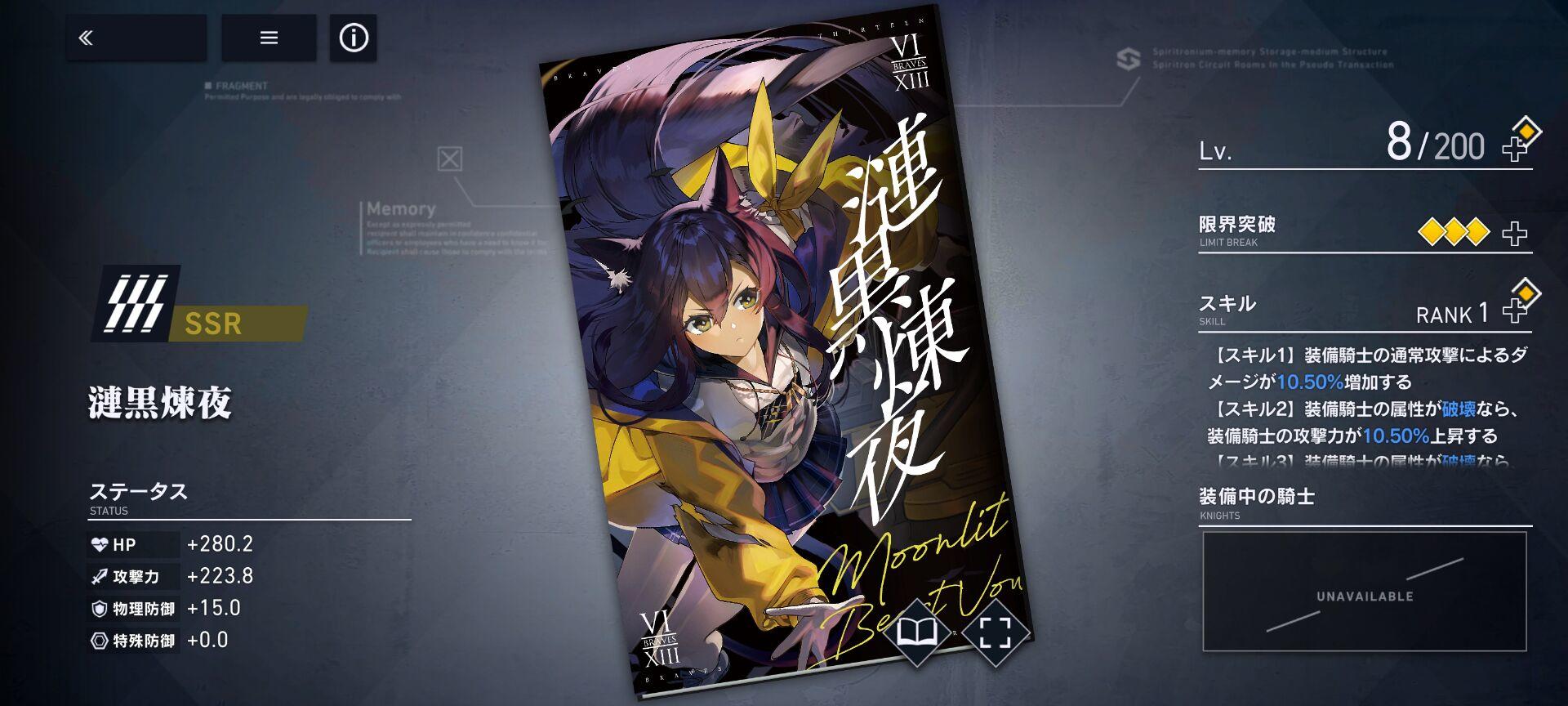 - BLADE:对前方的敌人造成250%伤害,释放后20秒内己方破坏属性骑士攻击提升30%,且自身HP低于50%时效果会额外增加50%
