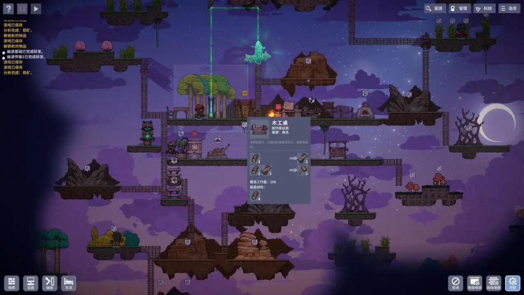 个人感觉这款游戏最有意思的是它的魔法系统,通过研究和建造魔法雕像,你就可以来为小人提供各种不同的加成,甚至还可以利用道具不断的反射一种名叫“幽波”的魔法光束,从而进行各种资源的全自动采集,如果你有能力的话,就可以设计出各种复杂高效的“线路”,如同《我的世界》红石线路一般,衍生出许多有趣的玩法,当无数复杂的线路井然有序的进行着,那种自豪感油然而生,我也终于可以体验现实中“理线”的乐趣了。这个玩法也拔高了这款游戏的上限,这无疑极大的延长了可以游玩的时间,不会因为低生存难度而快速的丧失游戏的乐趣,这一块我也是希望后续的版本中能看到制作组更多的巧思。魔法真是好东西!