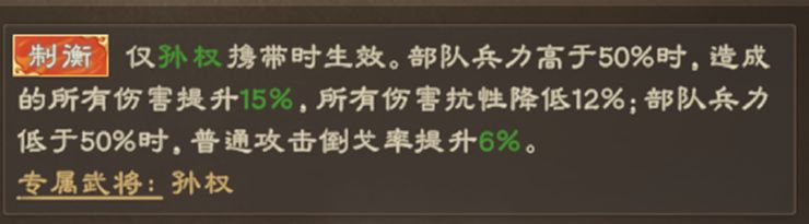 孙权·制衡先机:进入战斗后,若主将灵巧高于对方主将,提升部队25%普攻暴击伤害。